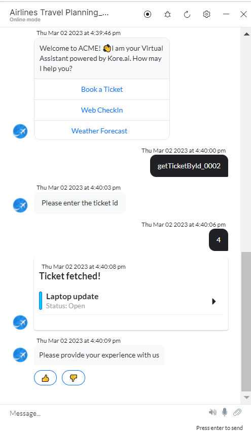 Follow the prompts in the App console to find a ticket by ID as shown below: