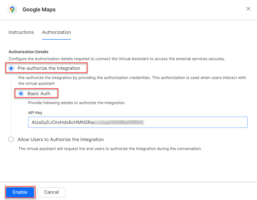 The Kore.ai XO Platform supports the following authorization types for the Google Maps integration: