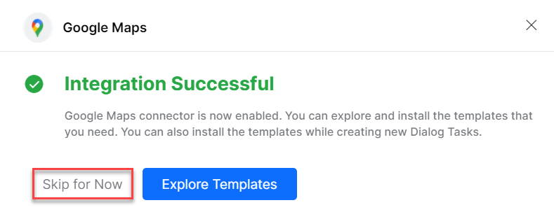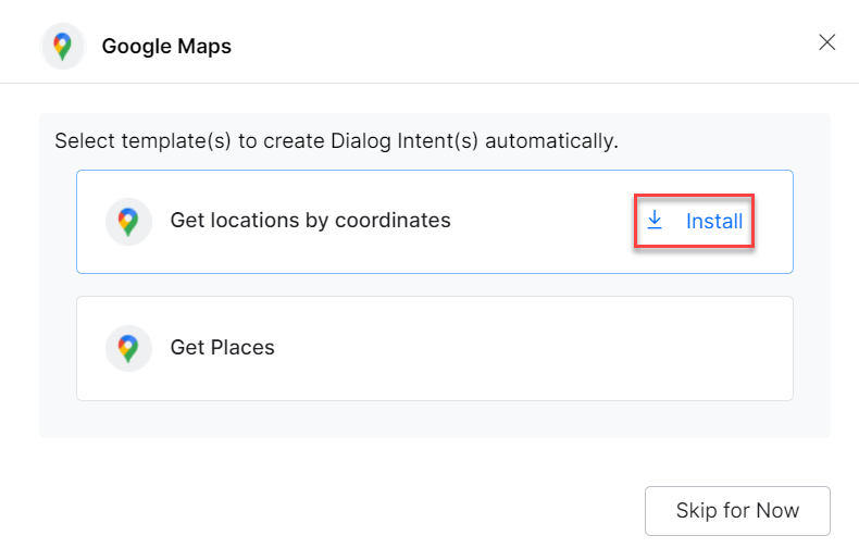 You can also click the Skip for Now button to install the Dialog Task templates later. To learn how to use action templates, read the Using the Google Maps action templates article.