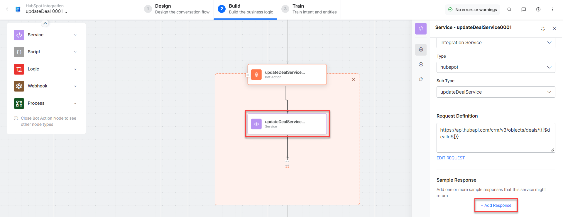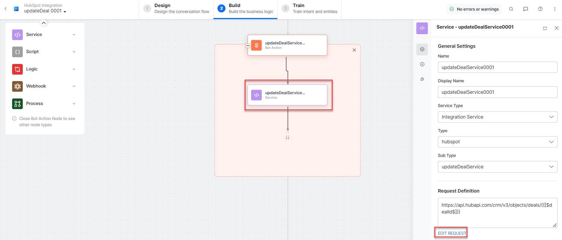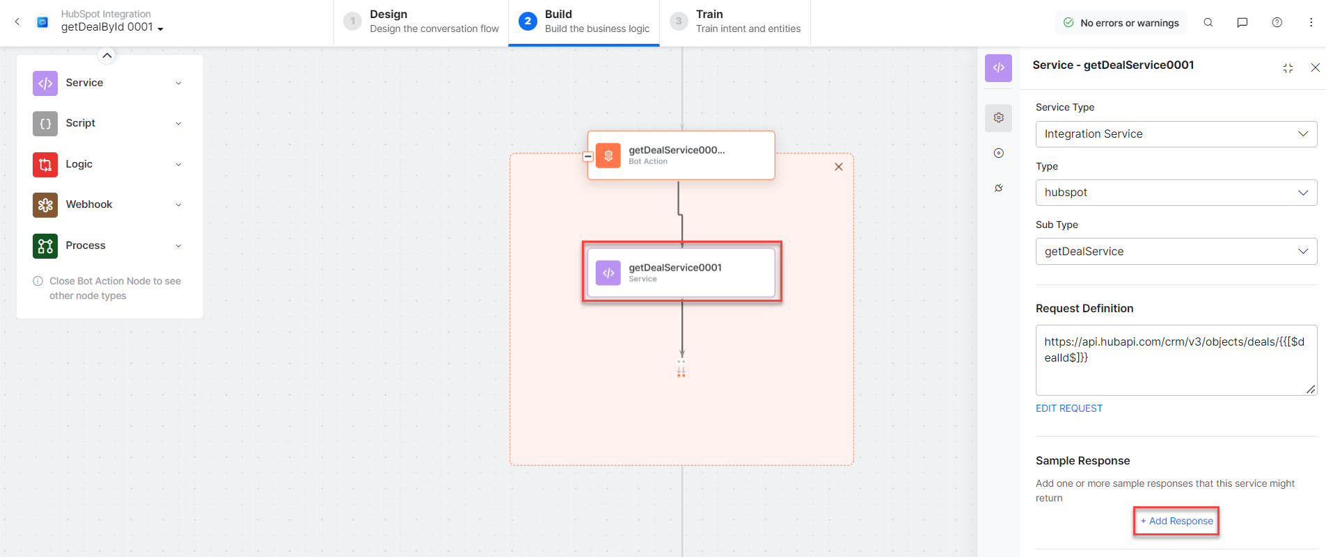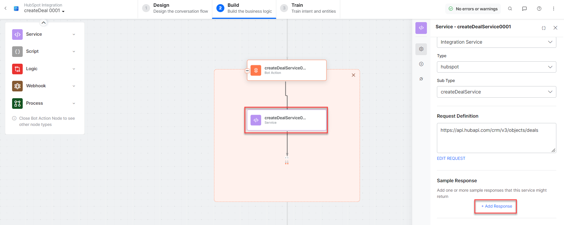 - getDealService – A bot action service to create a deal in an external integration. Click the Plus icon to expand to view the getDealService bot action component properties.