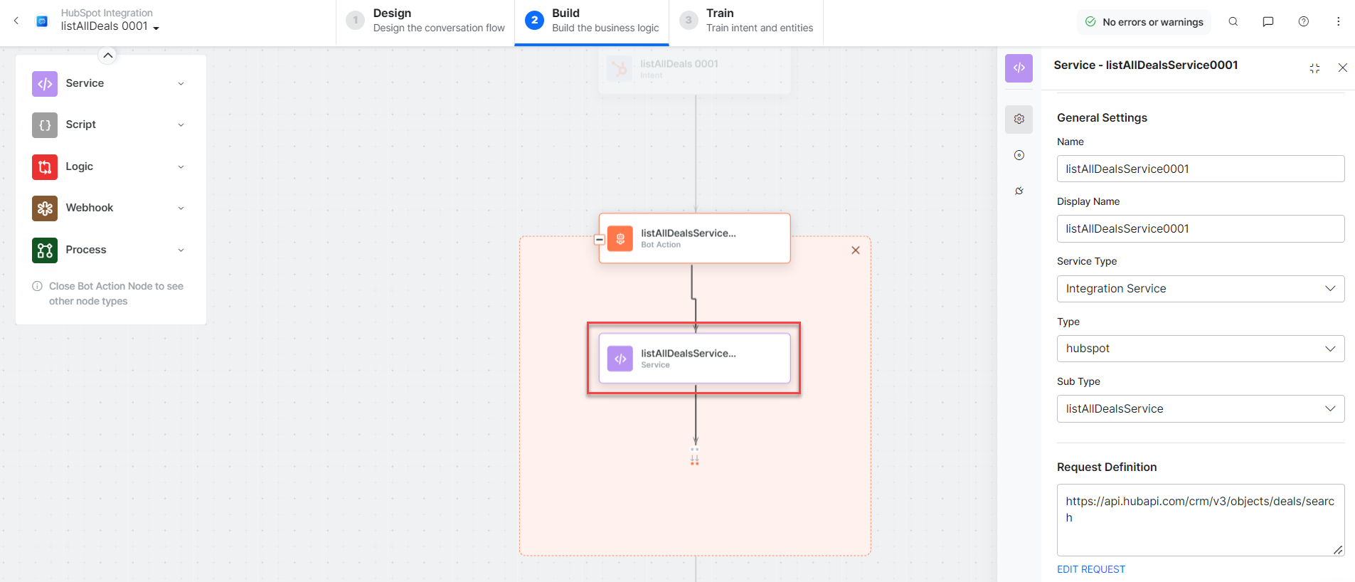 listAllDealsService – A bot action script to view all deals in an external integration. Click the Plus icon to expand to view the listAllDealsService bot action component properties.