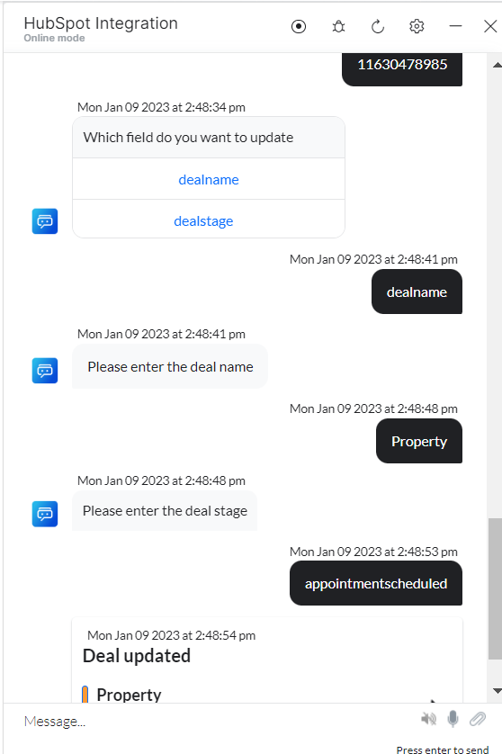 Enter all deal details to update when prompted by the AI Agent. The existing deal is updated in HubSpot as shown below:
