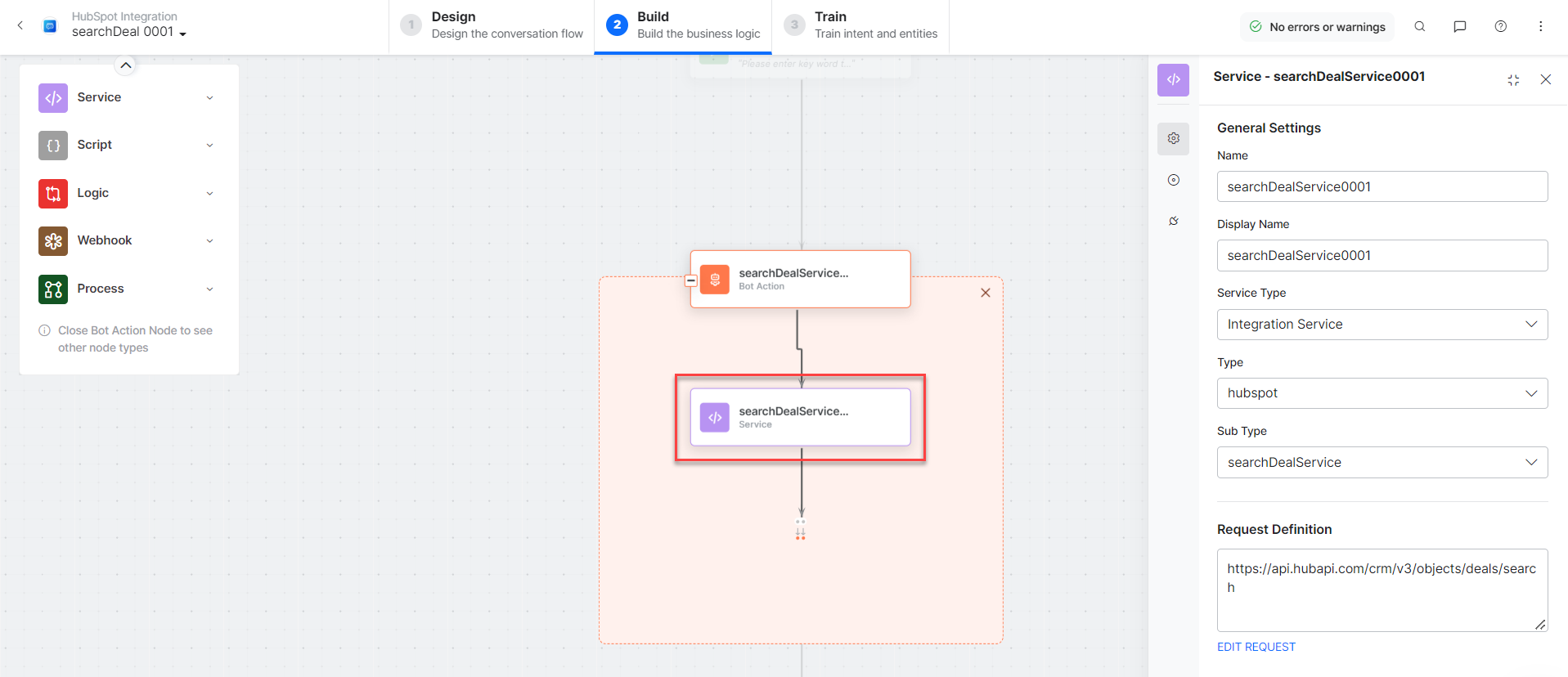 - getDealService – A bot action service to get deal details in an external integration. Click the Plus icon to expand to view the getDealService bot action component properties.