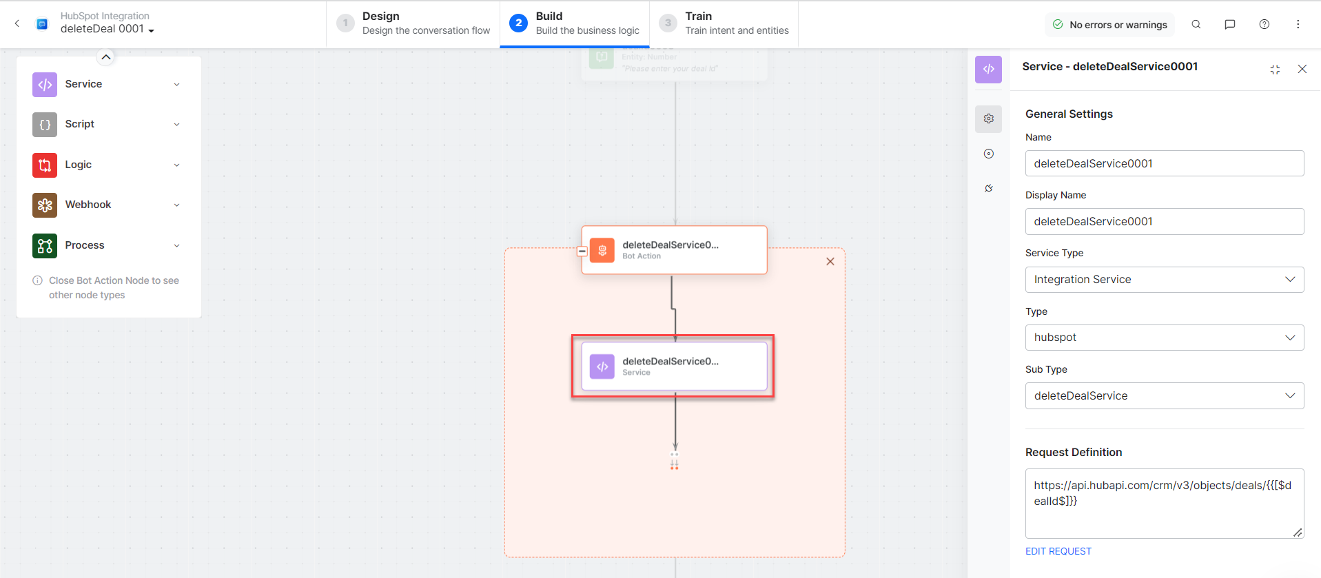 deleteDealService – A bot action script to delete a deal in an external integration. Click the Plus icon to expand to view the deleteContactService bot action component properties.