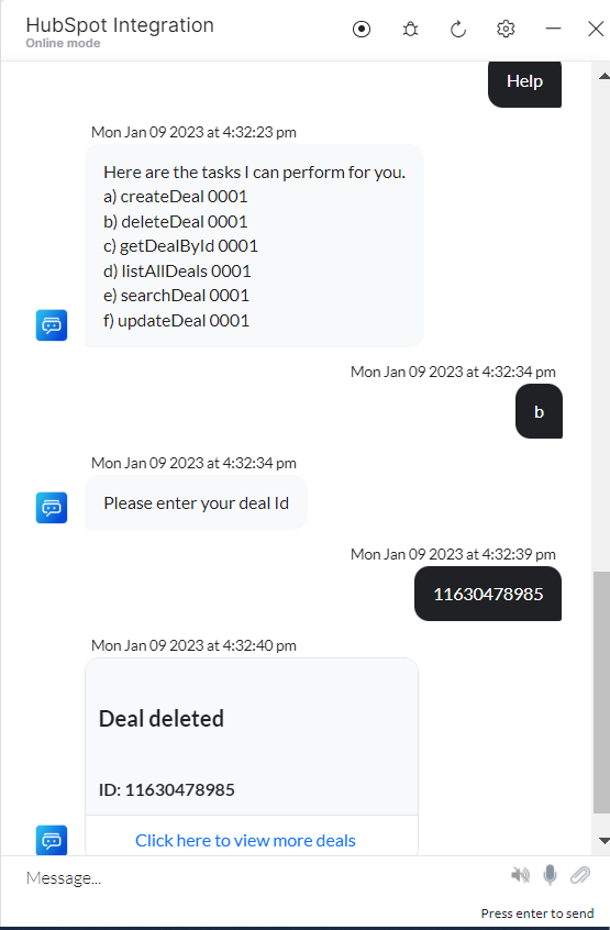 The Delete Deal dialog task is added for HubSpot with the following components: