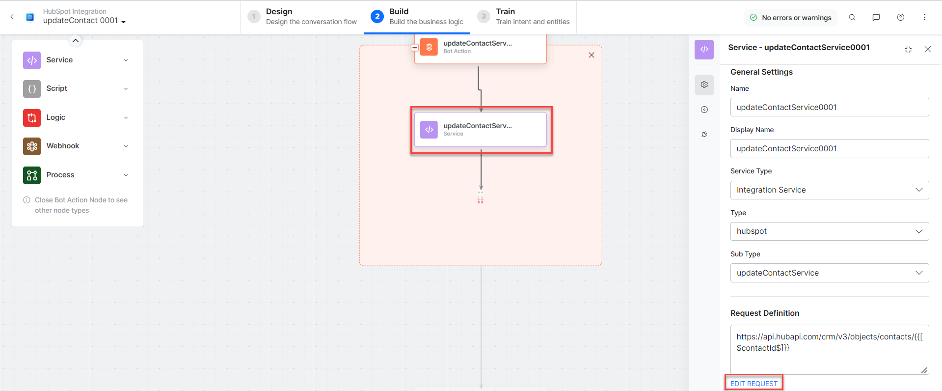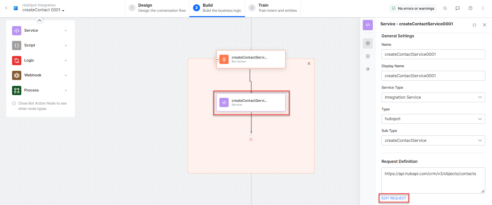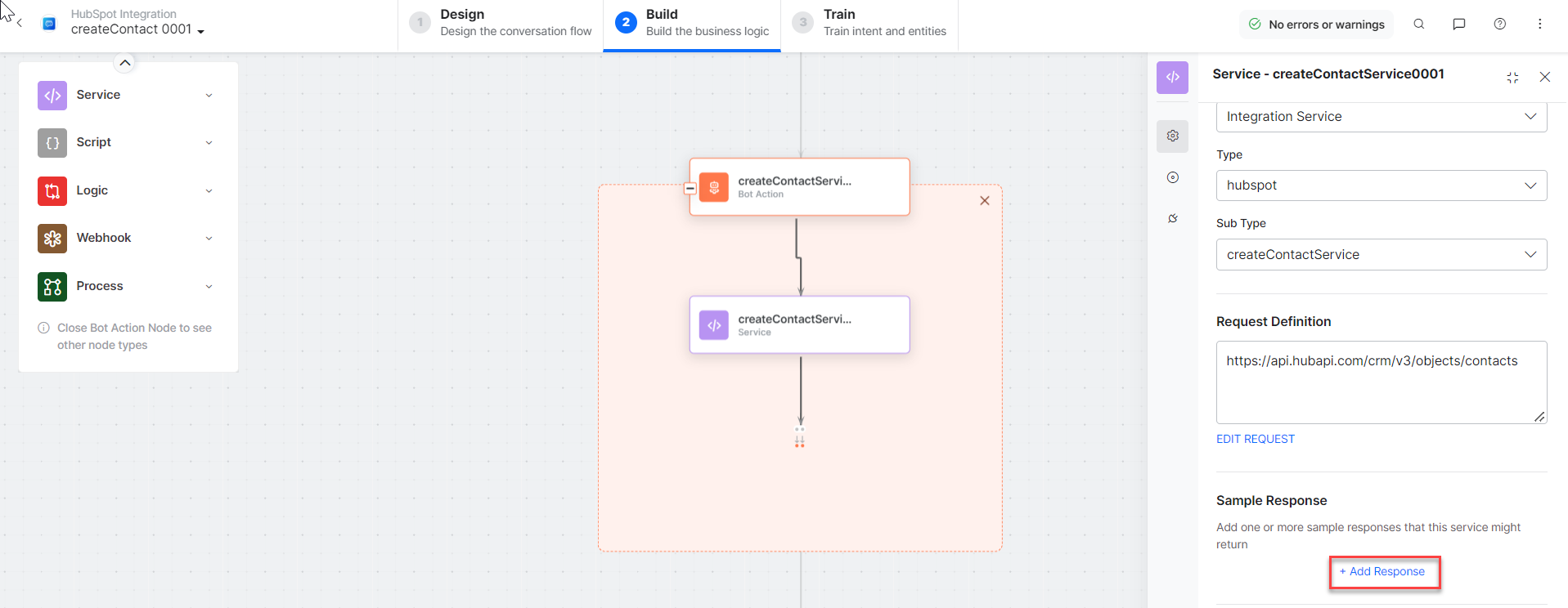 - createContactService – A bot action service to create a contact in an external integration. Click the Plus icon to expand to view the createContactService bot action component properties.