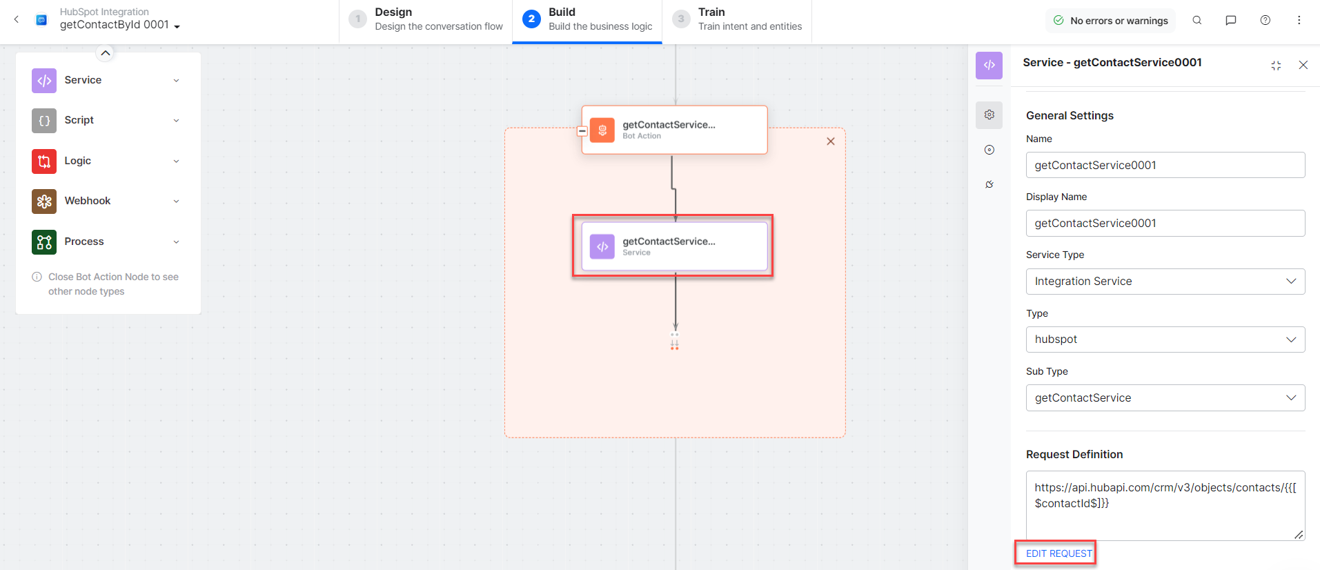 - getContactService – A bot action service to create a deal in an external integration. Click the Plus icon to expand to view the getDealService bot action component properties.