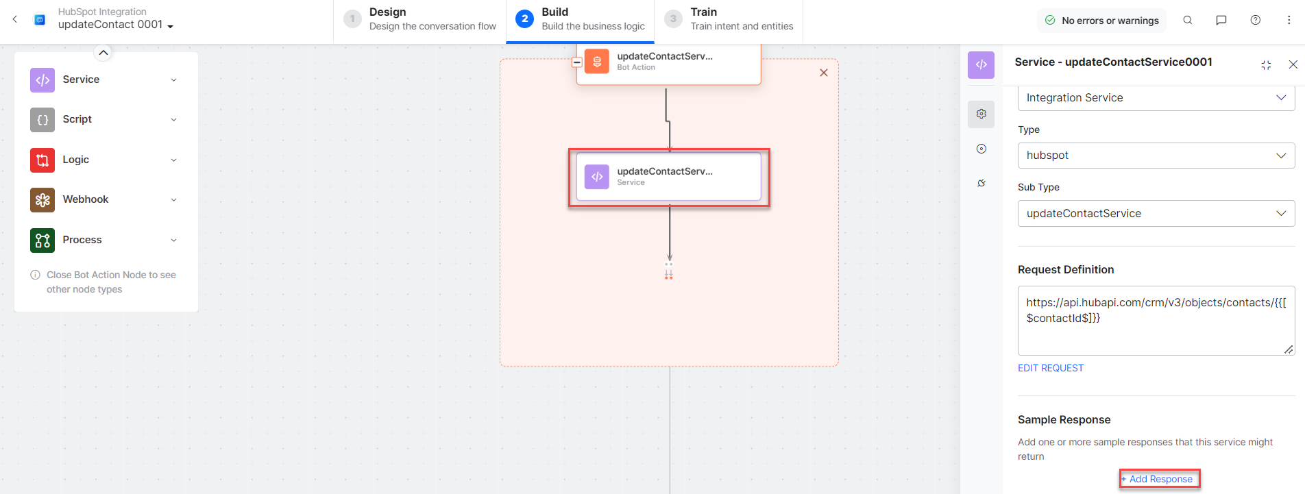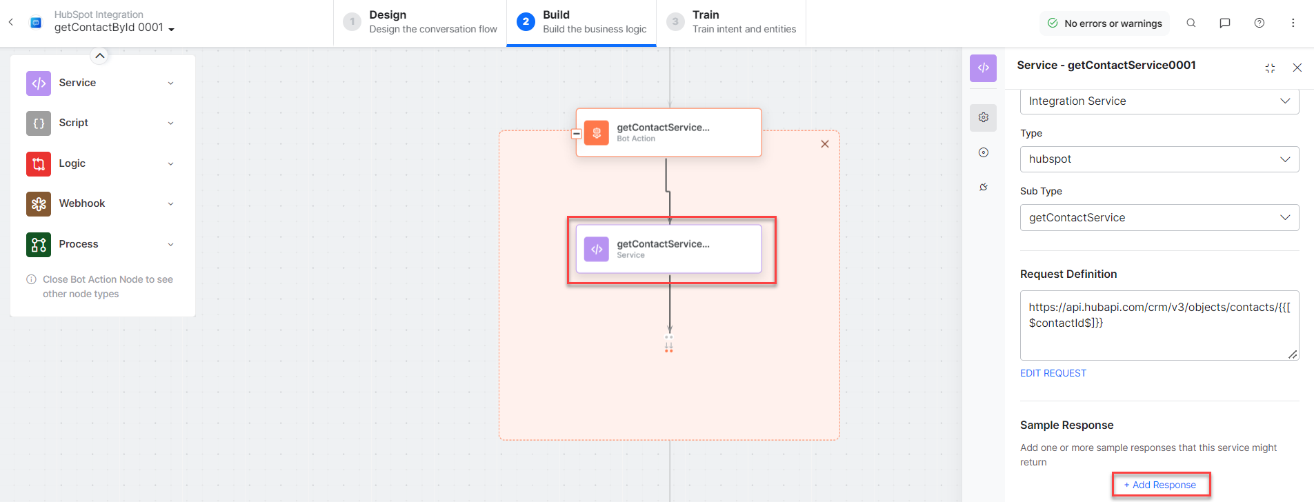 - getContactService – A bot action service to get deal details in an external integration. Click the Plus icon to expand to view the getContactService bot action component properties.