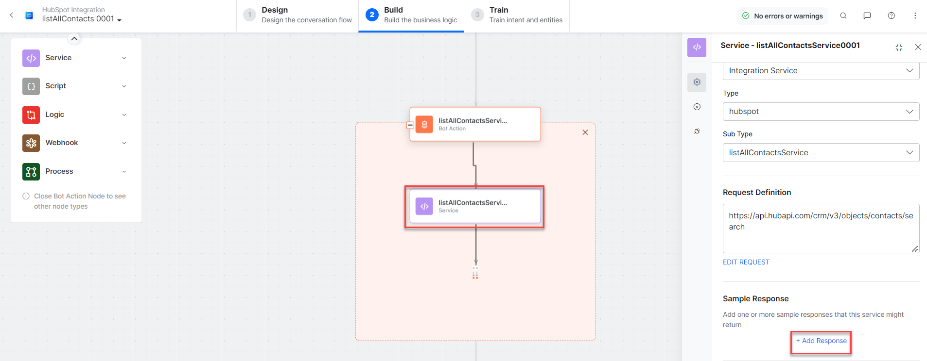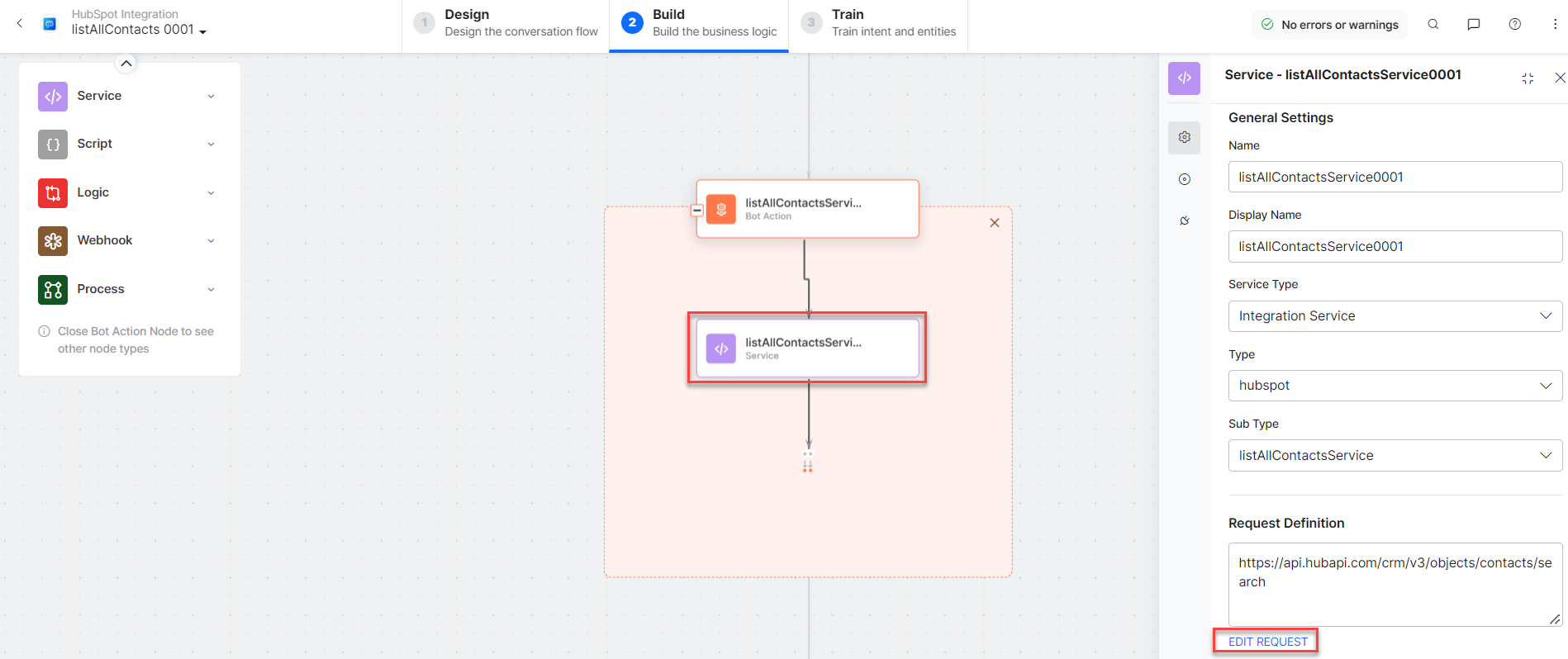 listAllContactsService – A bot action script to view all contacts in an external integration. Click the Plus icon to expand to view the listAllContactsService bot action component properties.