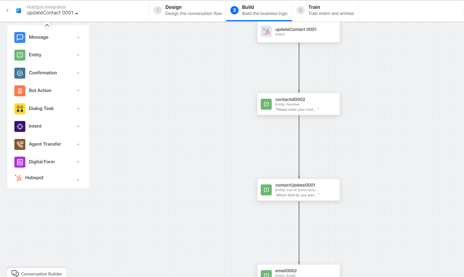 - contactId, contactUpdate, email, firstName, lastName, and phone – Entity nodes for updating the contact details.