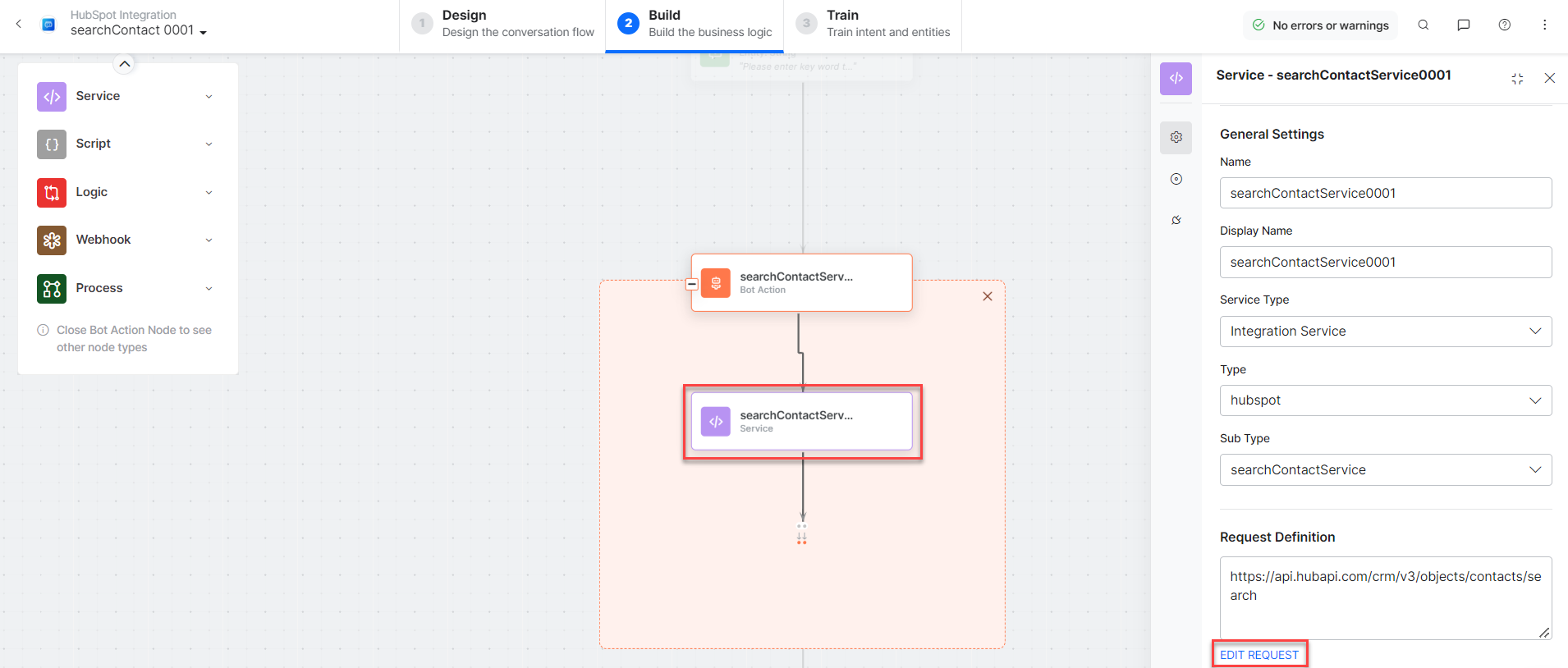 - searchContactService – A bot action script to update a deal in an external integration. Click the Plus icon to expand to view the searchContactService bot action component properties.