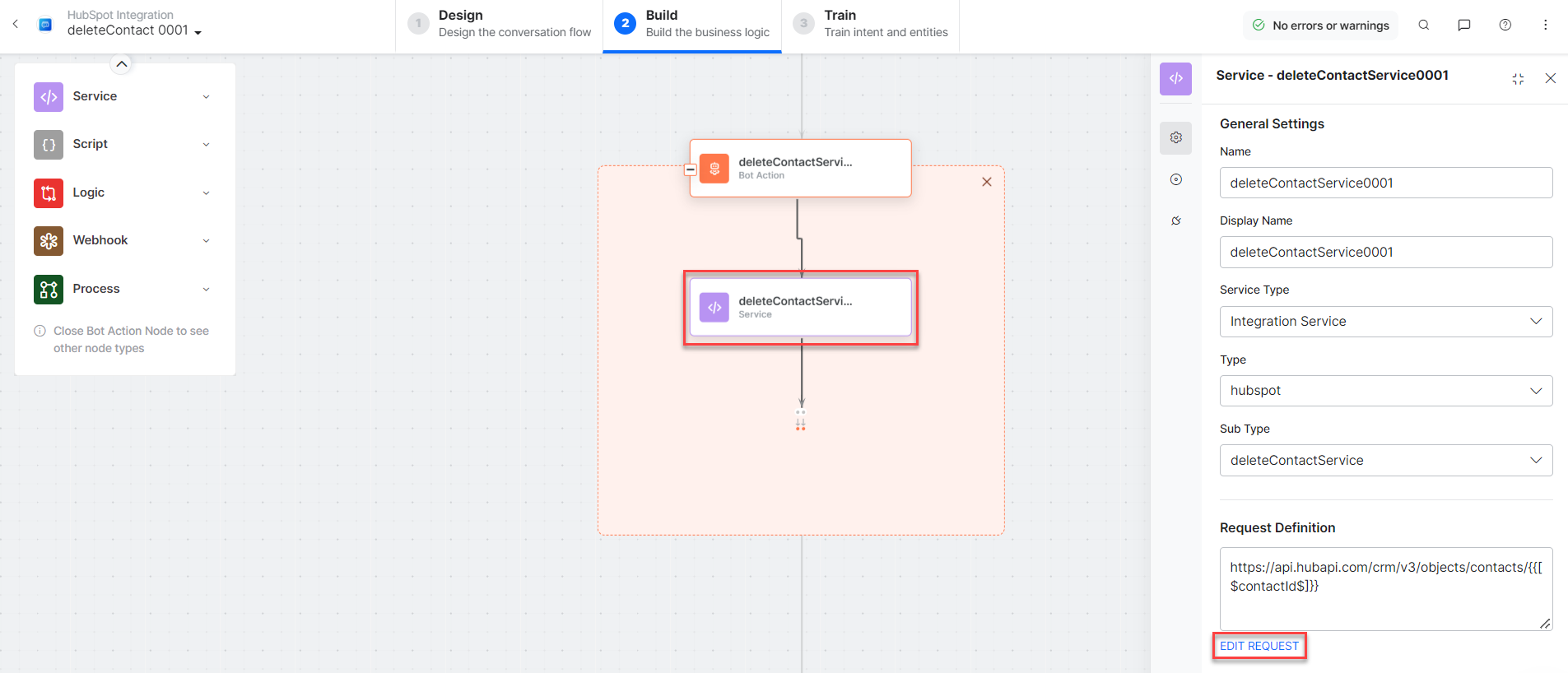 - deleteContactService – A bot action script to delete a deal in an external integration. Click the Plus icon to expand to view the deleteContactService bot action component properties.