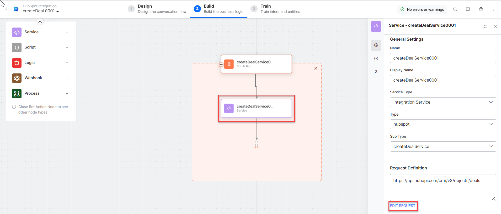 - createDealService – A bot action service to create a deal in an external integration. Click the Plus icon to expand to view the createDealService bot action component properties.