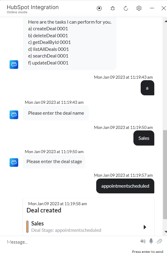 You can use the Prebuilt Action Templates from your HubSpot integration to auto-create dialog tasks and test them using the Talk to Bot option.