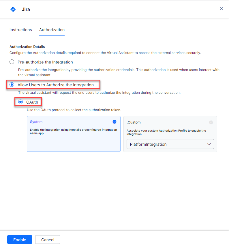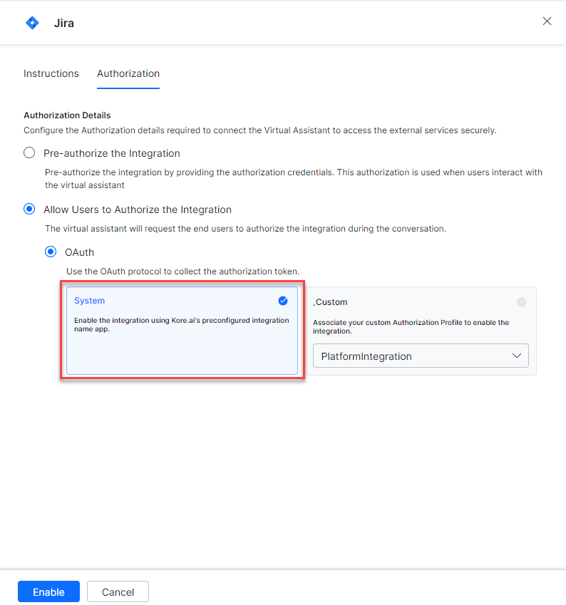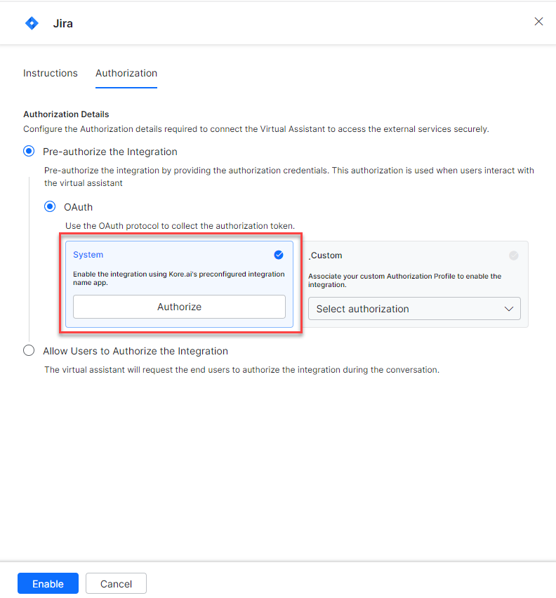 Select the System card to enable the Kore.ai’s preconfigured JIRA app and click Authorize.