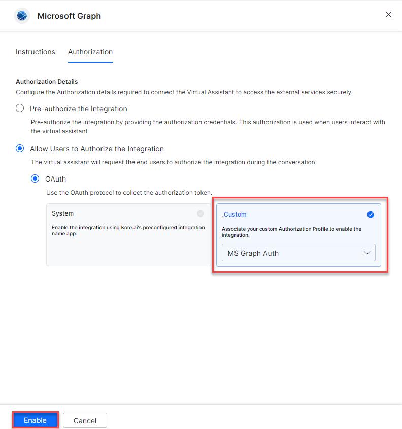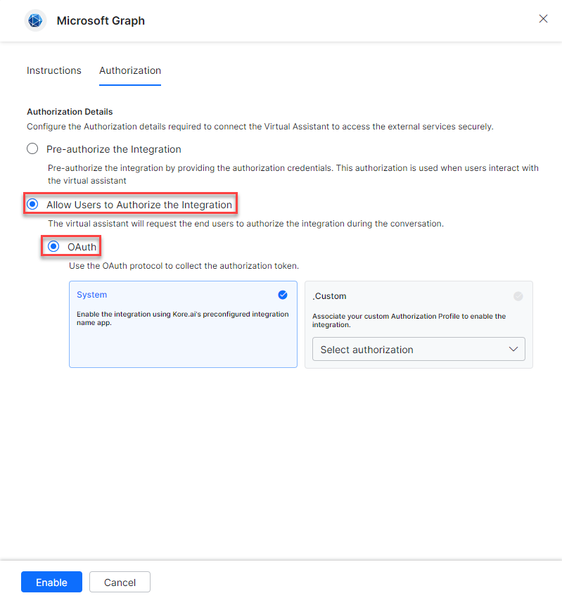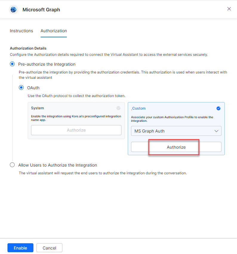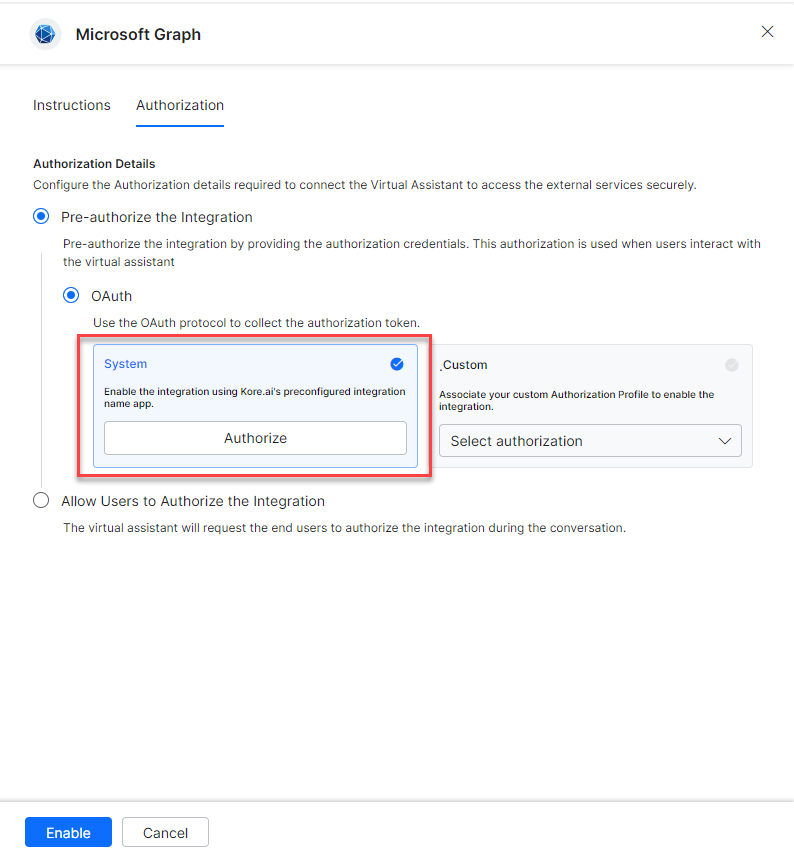 Select the System card to enable the Kore.ai’s preconfigured Microsoft Graph app and click Authorize.