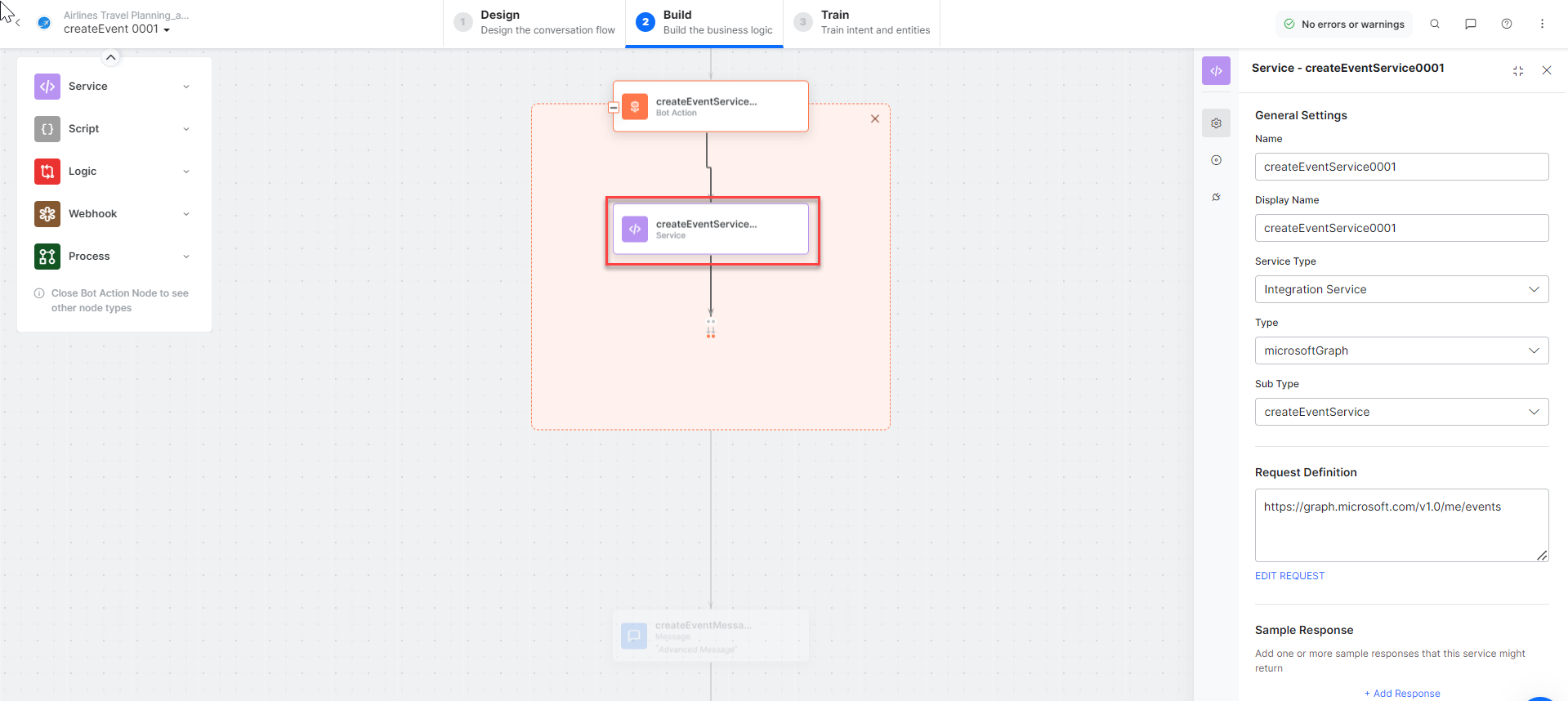 - createEventService: A bot action service to create an event in an external integration. Click the Plus icon to expand to view the createEventService bot action component properties.