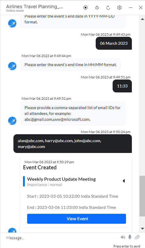 - eventSubject, startDate, startTime, endDate, endTime, and attendeesEmailAddresses: Entity nodes for gathering the required event details