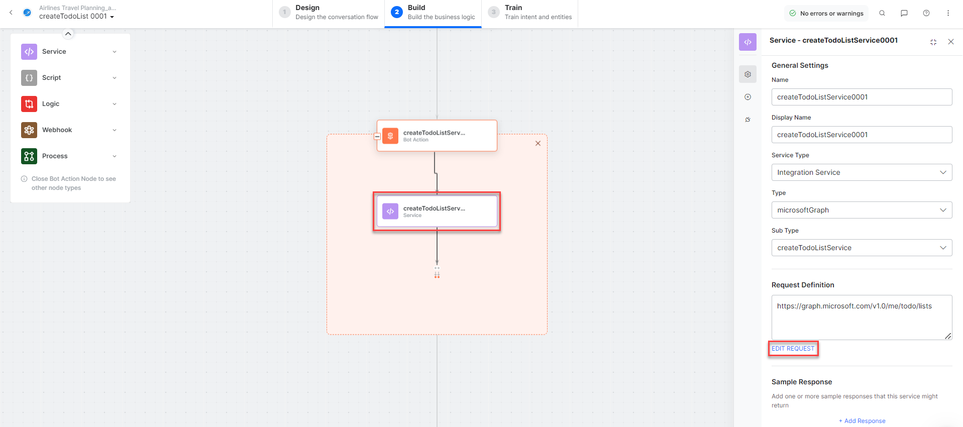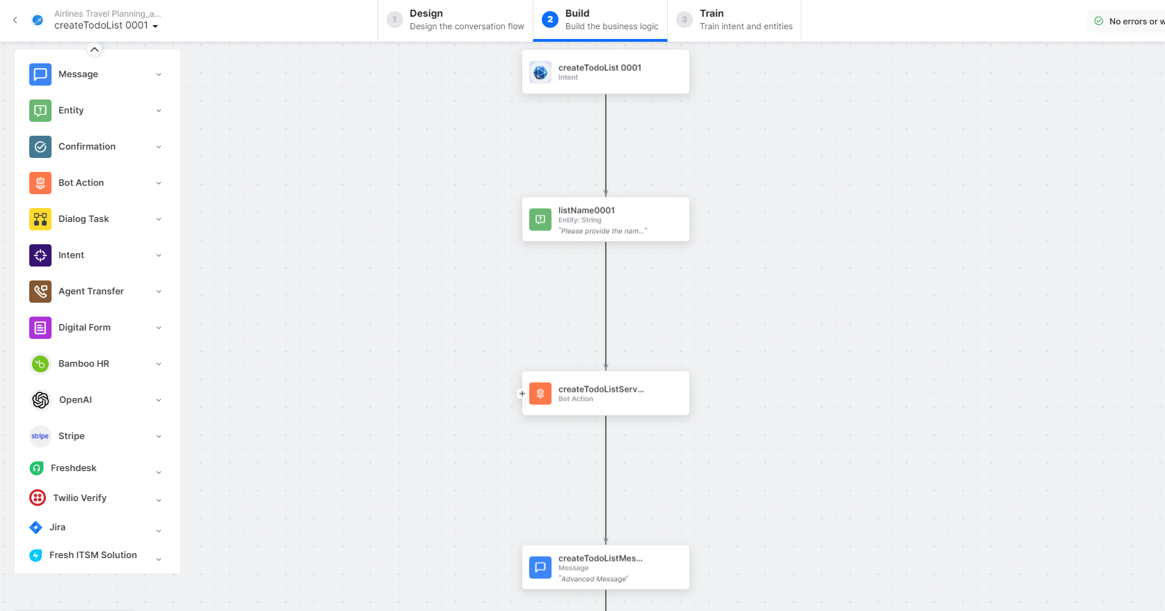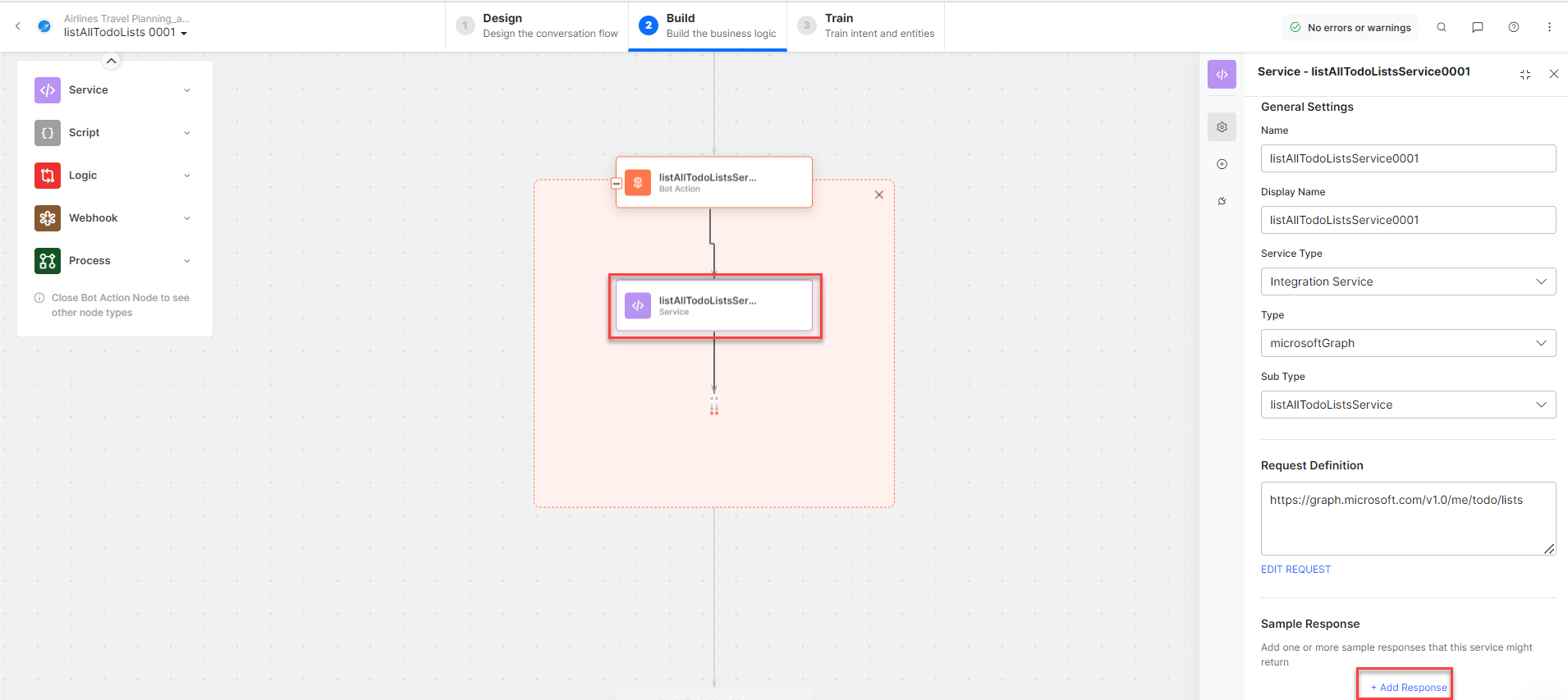 - createTodolistService: A bot action service to create a todo list in an external integration. Click the Plus icon to expand to view the createTodoListService bot action component properties.