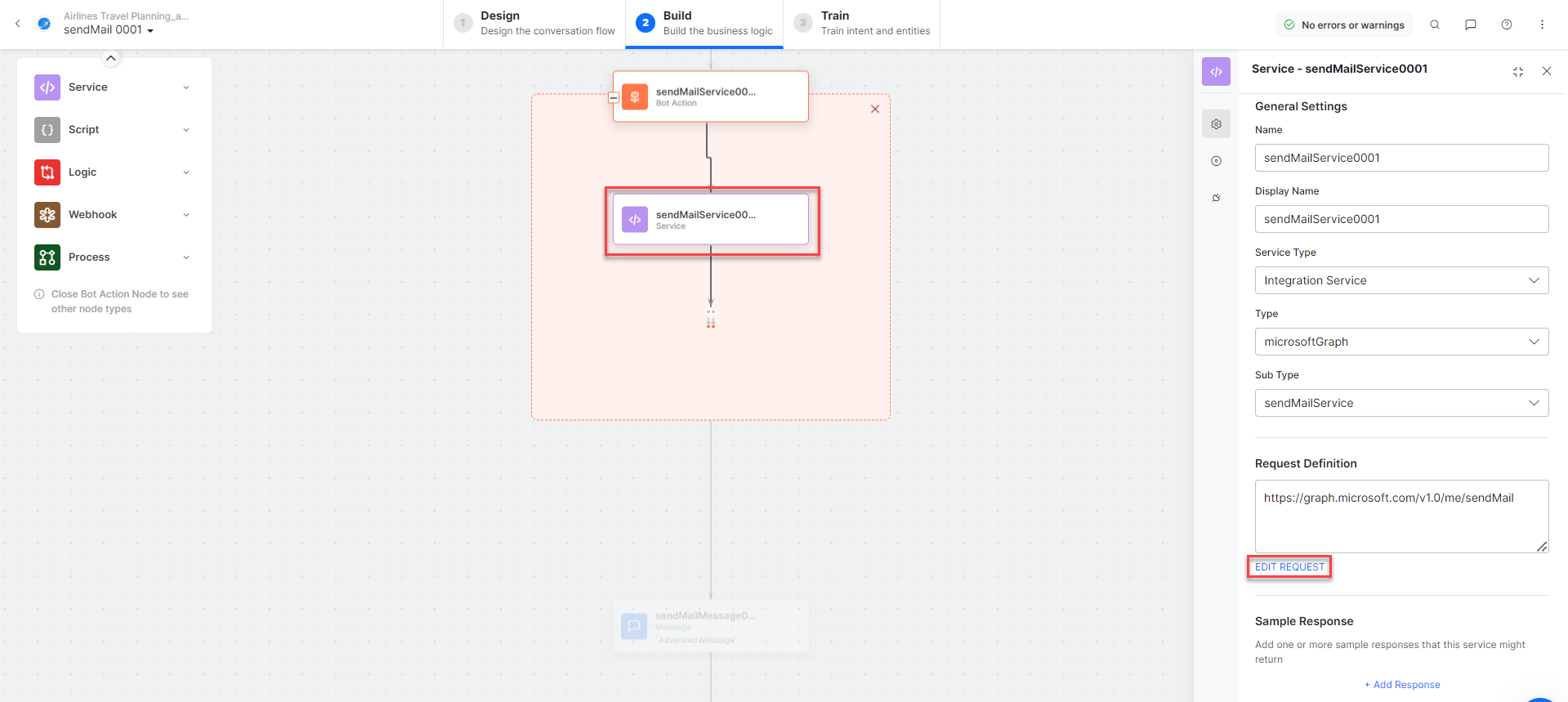 - sendEmailService: A bot action service to send email from an external integration. Click the Plus icon to expand to view the sendEmailService bot action component properties.
