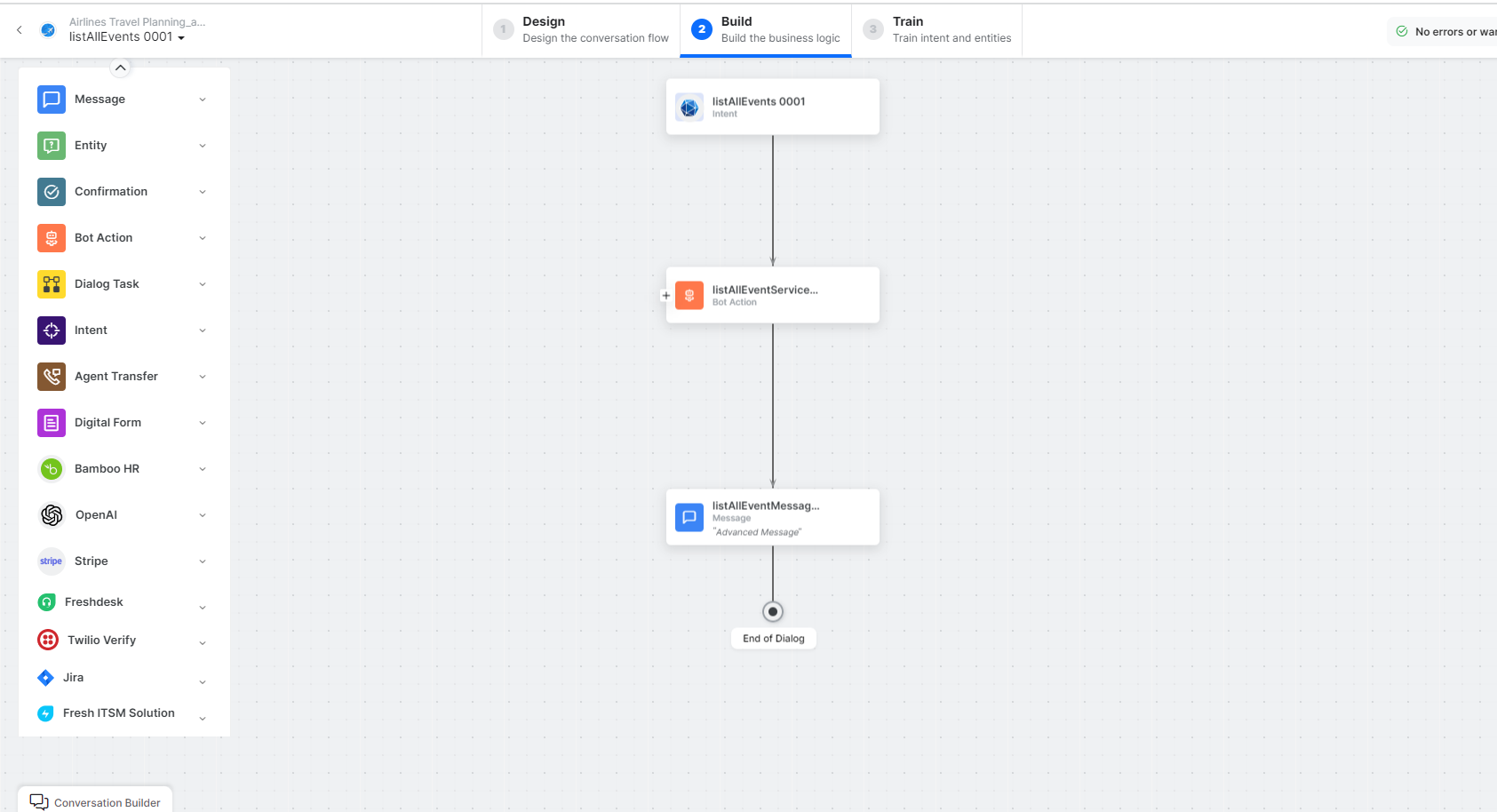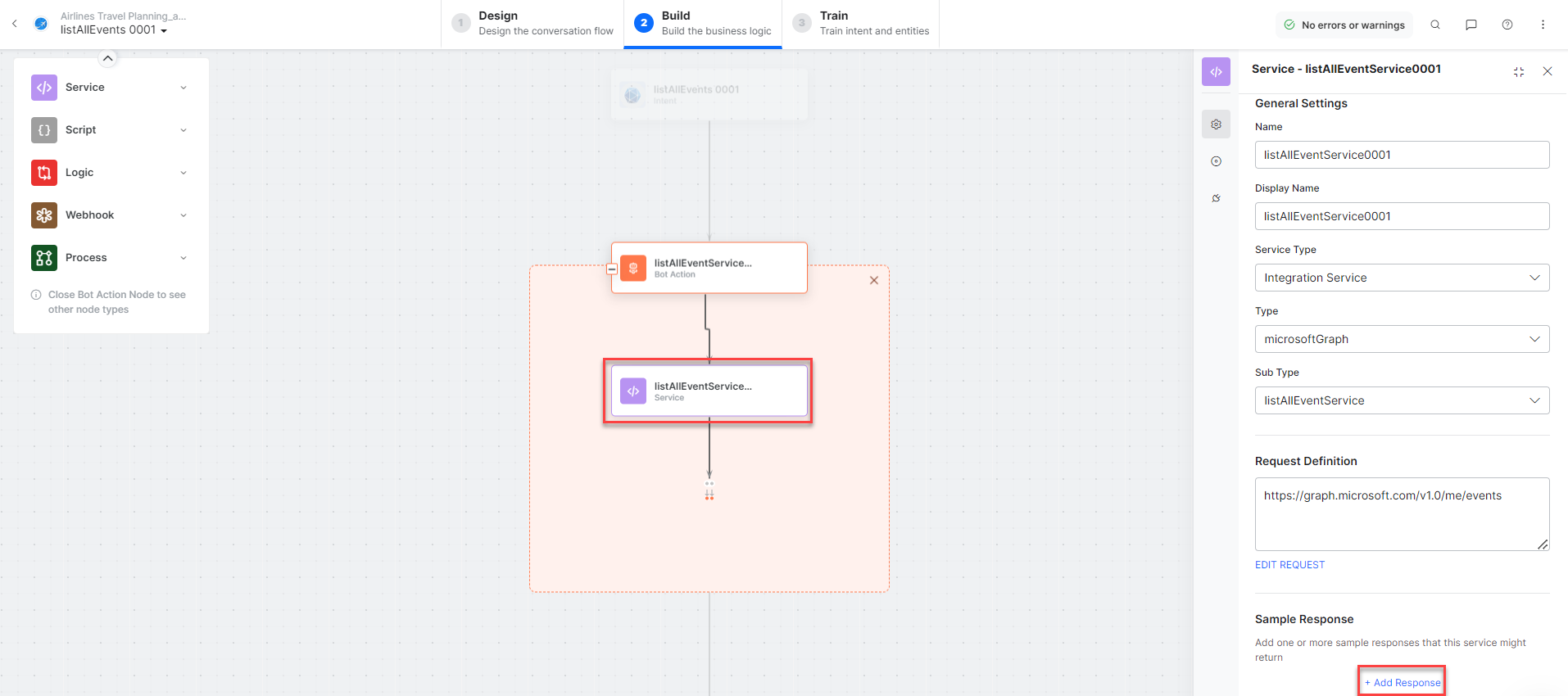 - listAllEventsService: A bot action service to view all events in an external integration. Click the Plus icon to expand to view the listAllEventsService bot action component properties.