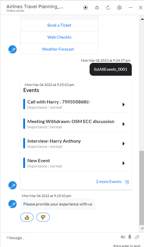 listAllEventstMessage: A message node with the script to display responses for various events.