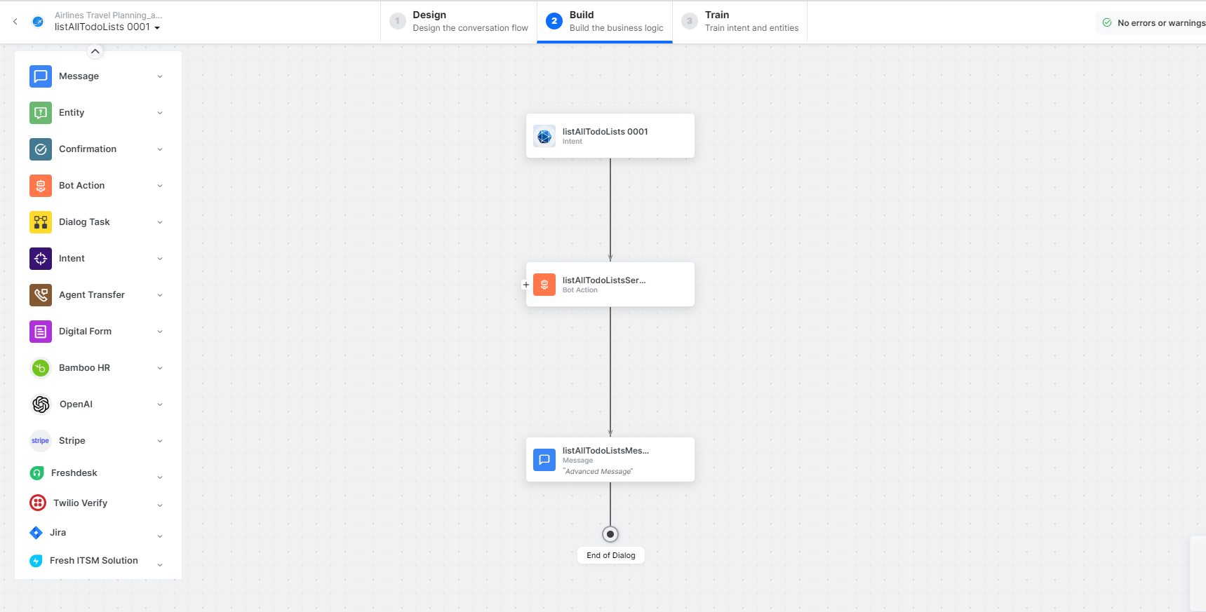 listAllTodoListsMessage: A message node with script to display responses for various to-do lists.