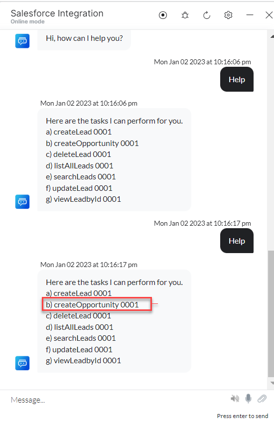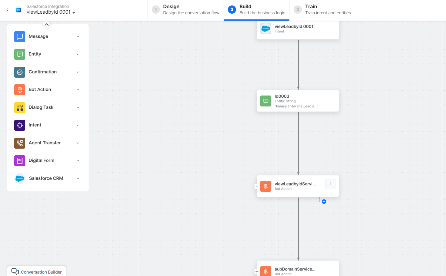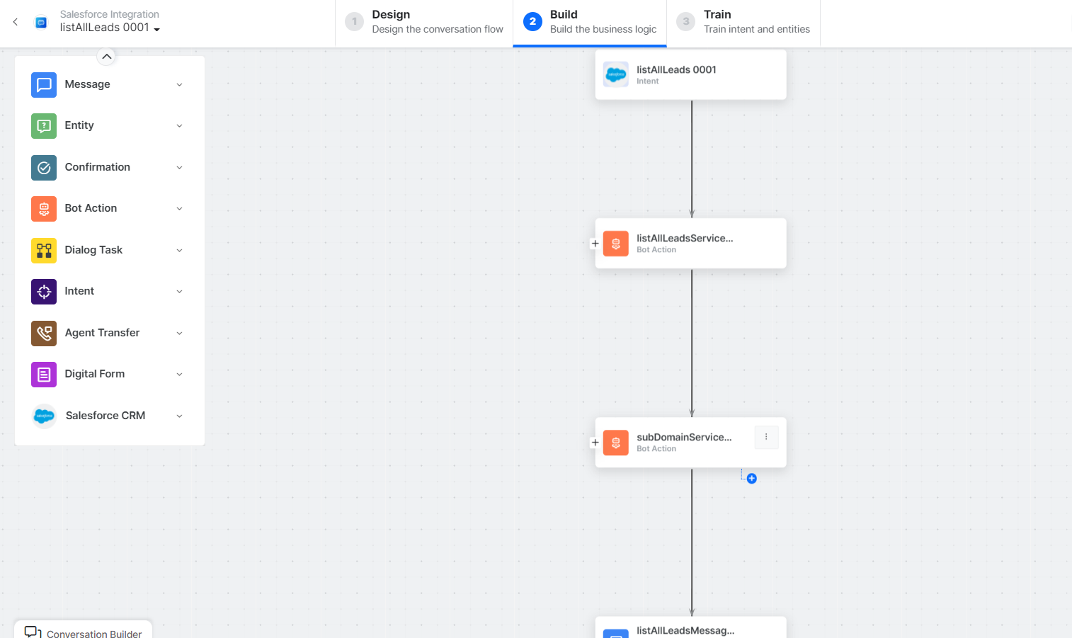 6. subDomainService – A bot action service to add subdomain in an external integration. Click the Plus icon to expand to view the subDomainService bot action component properties. 7. createOpportunityMessage – A message node with script to display responses for various scenarios.