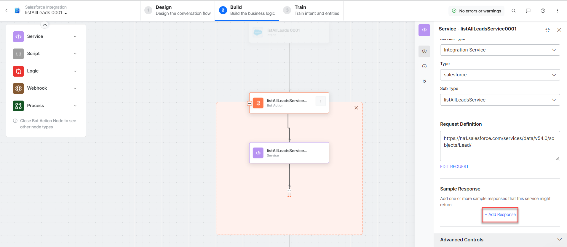 viewLeadbyIdService – A bot action script to view a lead using ID in an external integration. Click the Plus icon to expand to view the listAllLeadsService bot action component properties and click the + Add Response link.