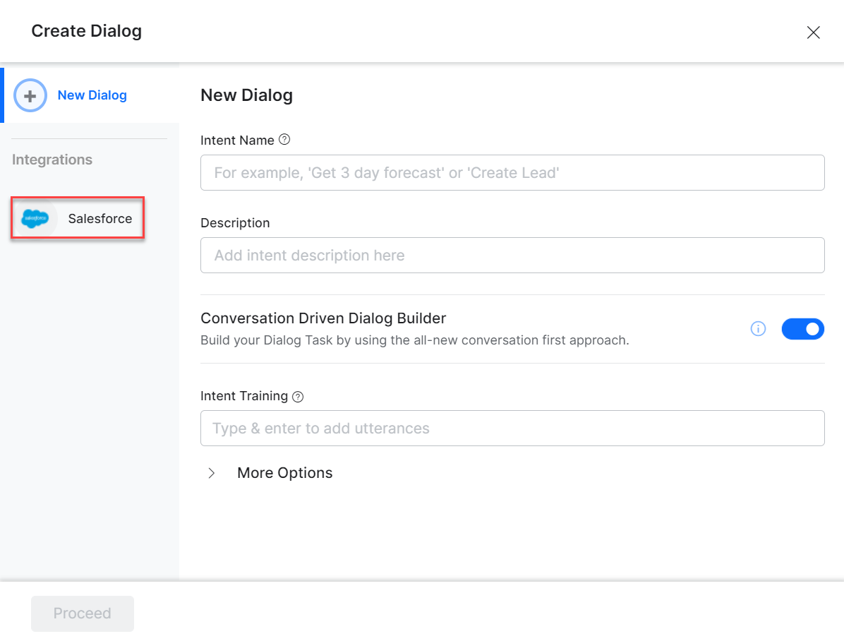 On the Dialog Task pop-up, under the Integration, select the Salesforce option to view the action templates.