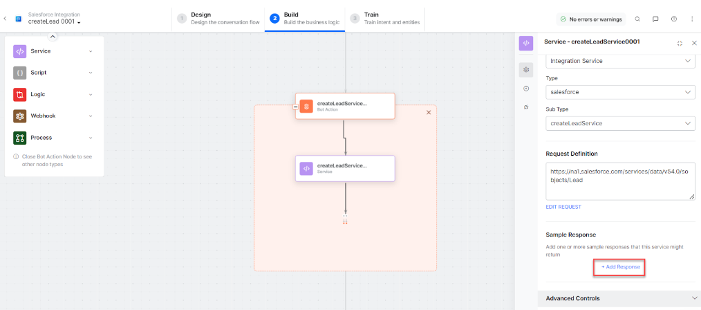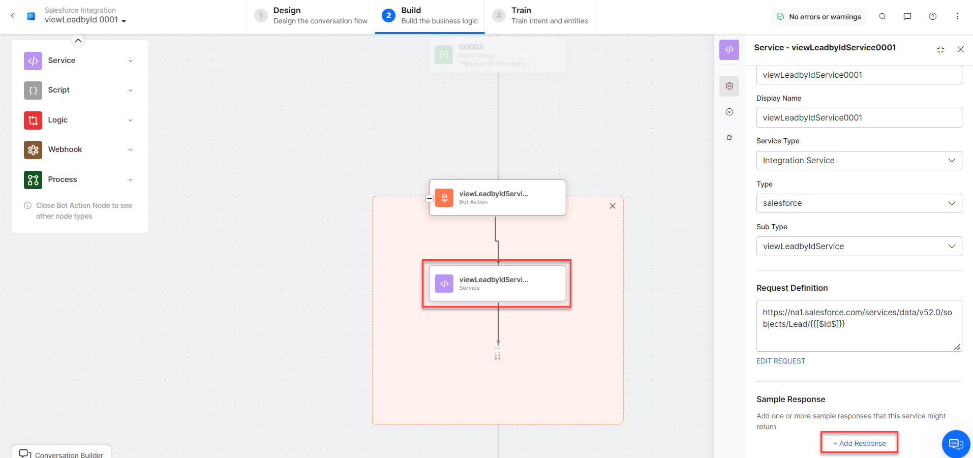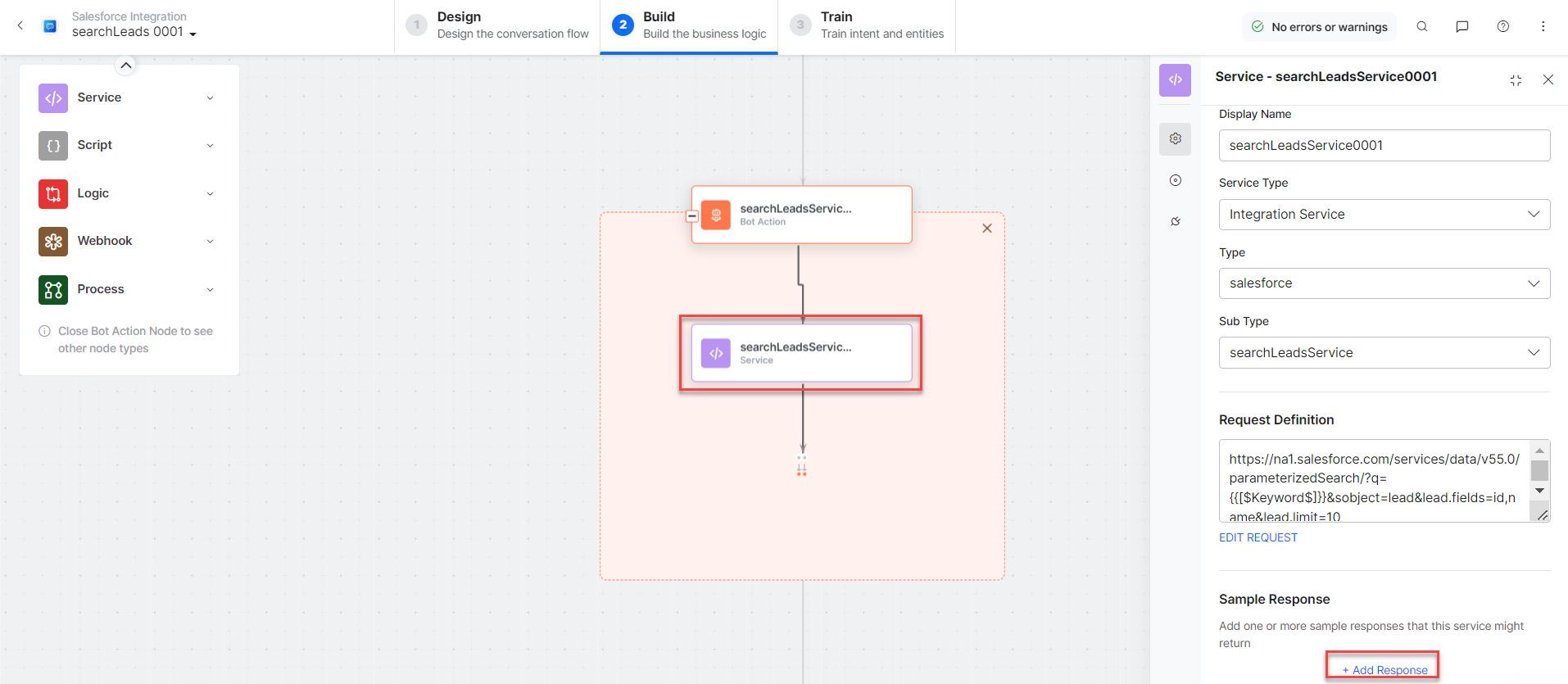 searchLeadsService – A bot action script to search leads in an external integration. Click the Plus icon to expand to view the searchLeadsService bot action component properties and click the +Add Response link.