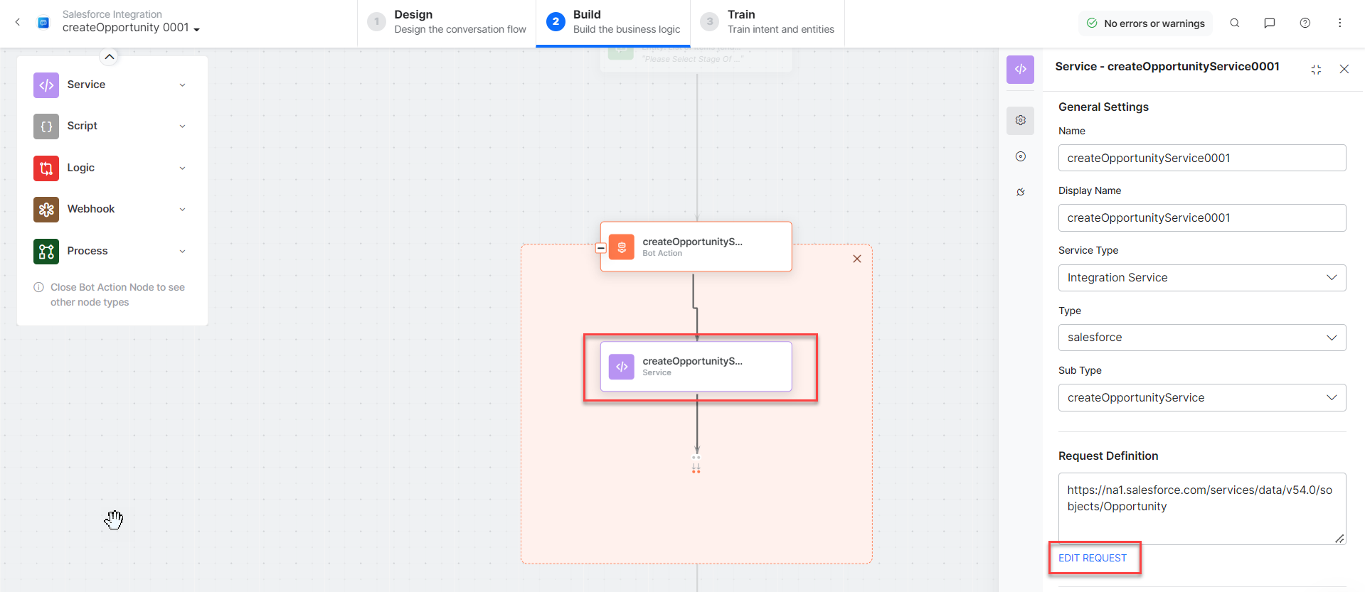 - CreateOpportunityService – A bot action script to create an opportunity in an external integration. Click the Plus icon to expand to view the createOpportunityService bot action component properties.