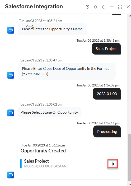 The new opportunity is created in Salesforce CRM. Click the Chevron icon to expand the new opportunity.