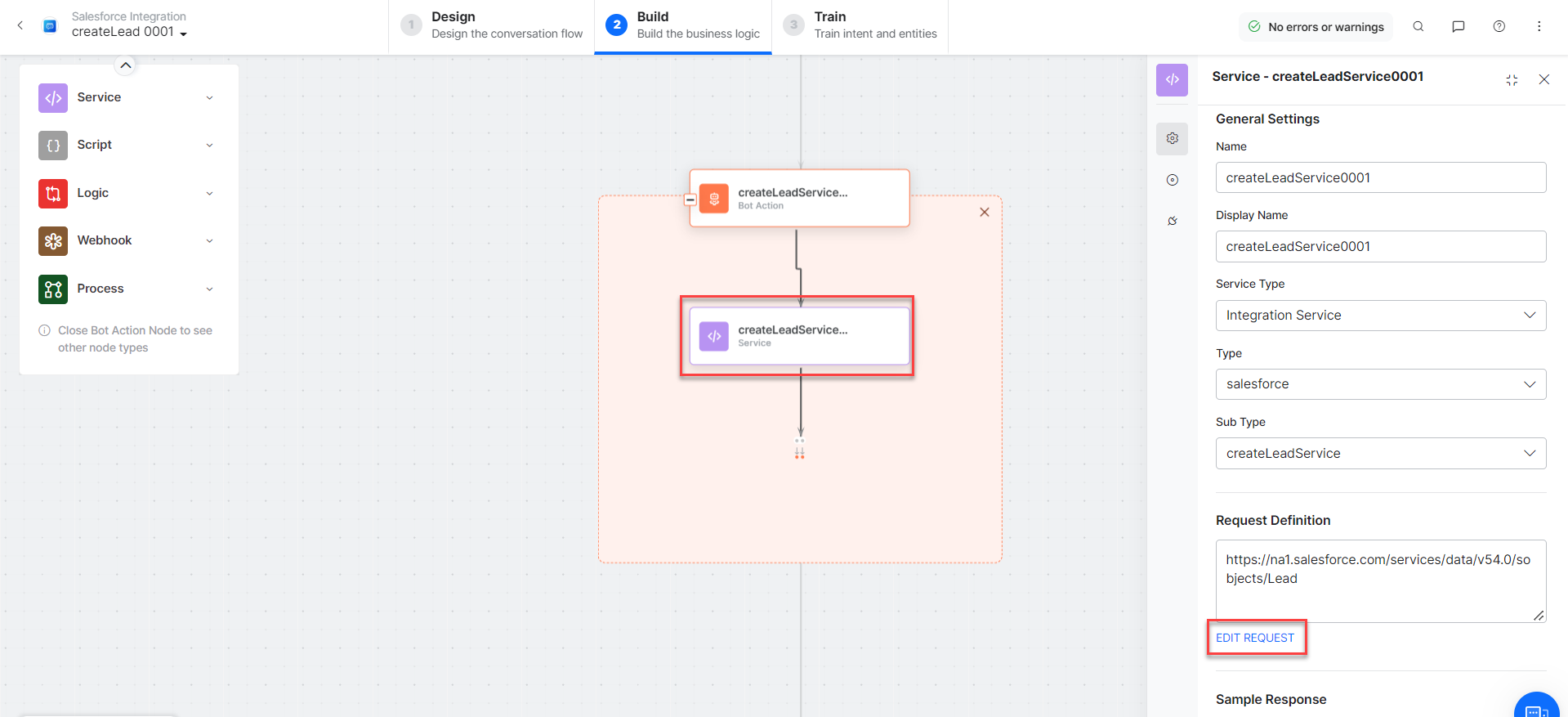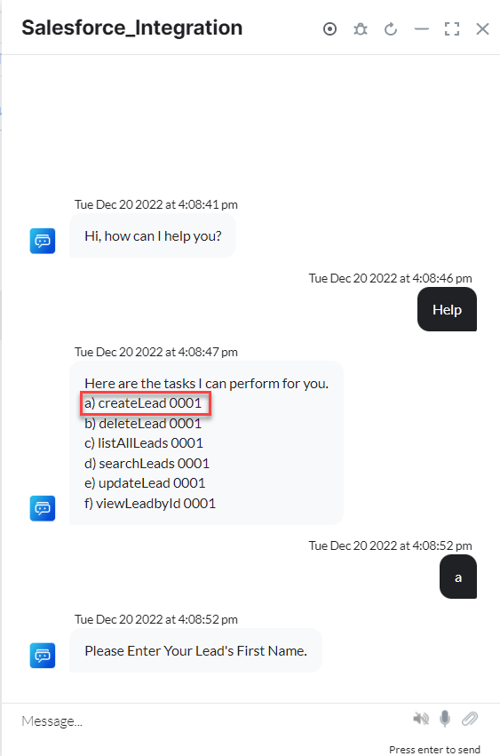 CreateLeadService – A bot action service to create a lead in an external integration. Click the Plus icon to expand to view the createLeadService bot action component properties.