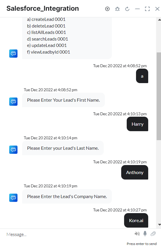 - firstName, lastName, and companyName – Entity nodes for gathering the required lead details.