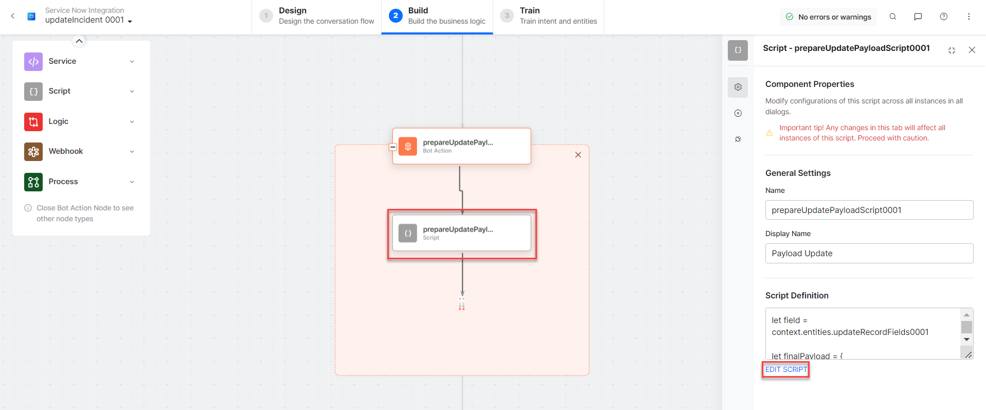 - prepareUpdatePayloadScript – A bot action script to update an incident in an external integration. Click the Plus icon to expand to view the prepareUpdatePayloadScript bot action component properties.