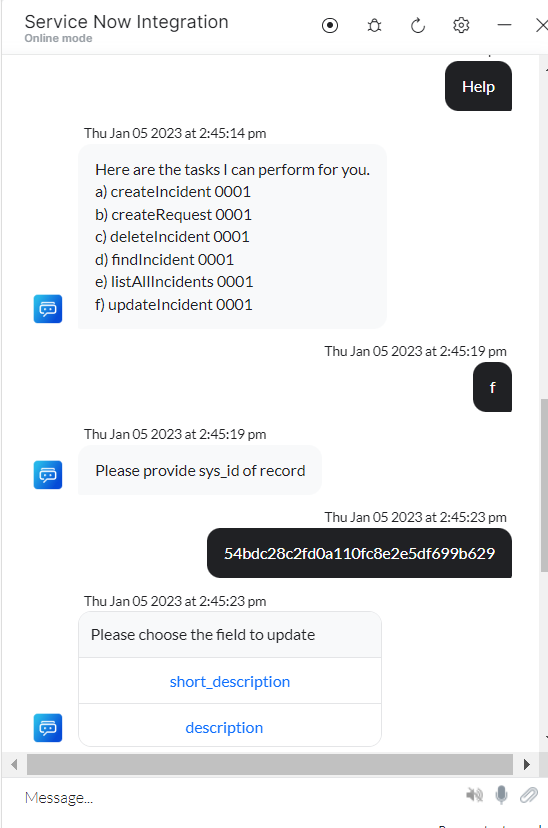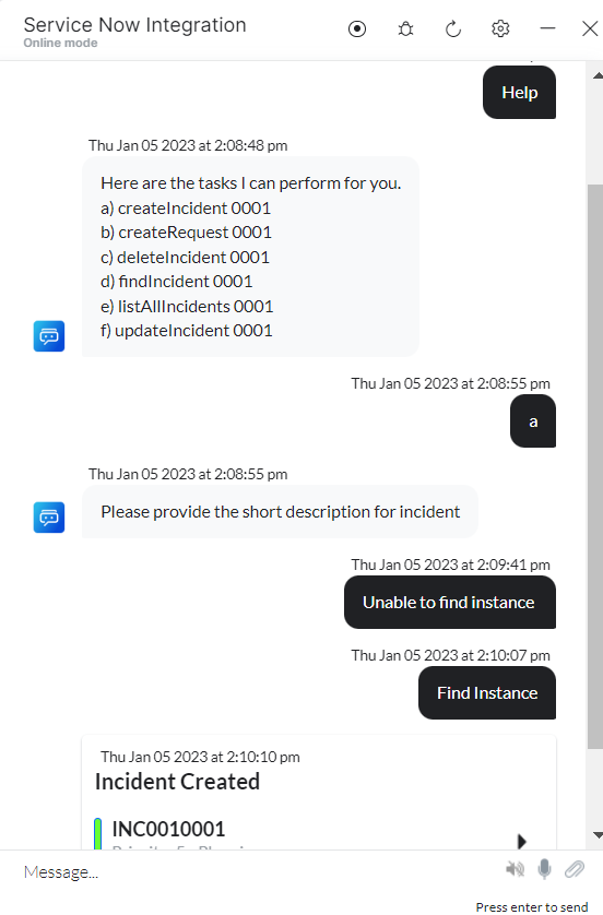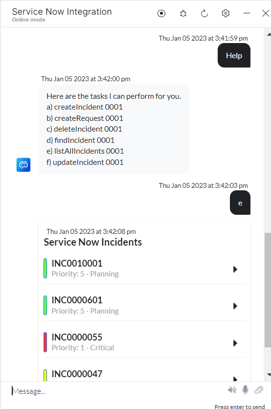 - createIncidentMessage – A message node with script to display responses for various scenarios.