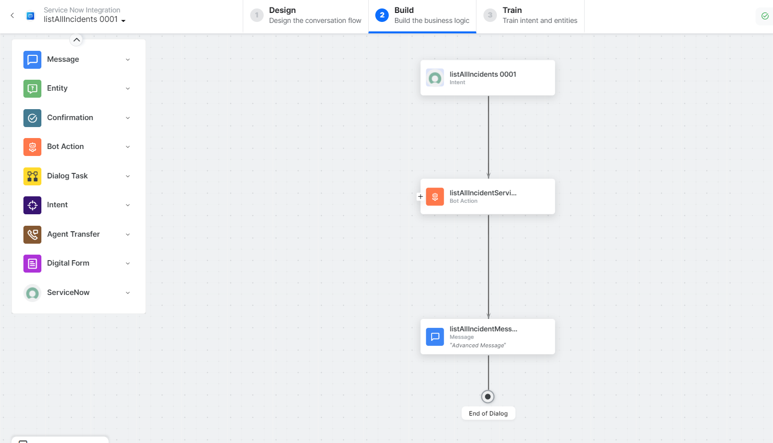 The List All Incidents dialog task is added for the ServiceNow with the following components: