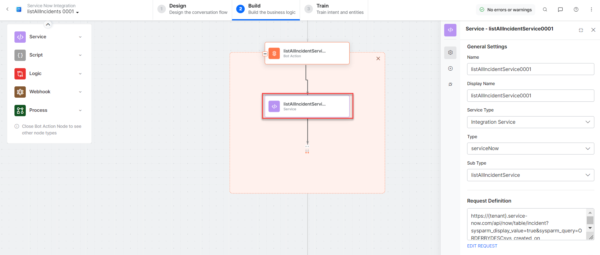 listAllRequestsService – A bot action script to view all incidents in an external integration. Click the Plus icon to expand to view the listAllRequestService bot action component properties.