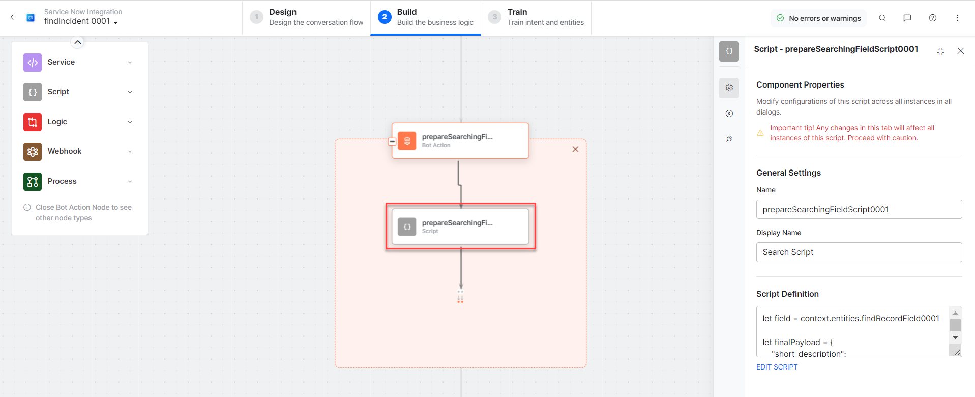prepareSearchingFieldScript – A bot action script to update an incident in an external integration. Click the Plus icon to expand to view the prepareSearchingFieldScript bot action component properties.