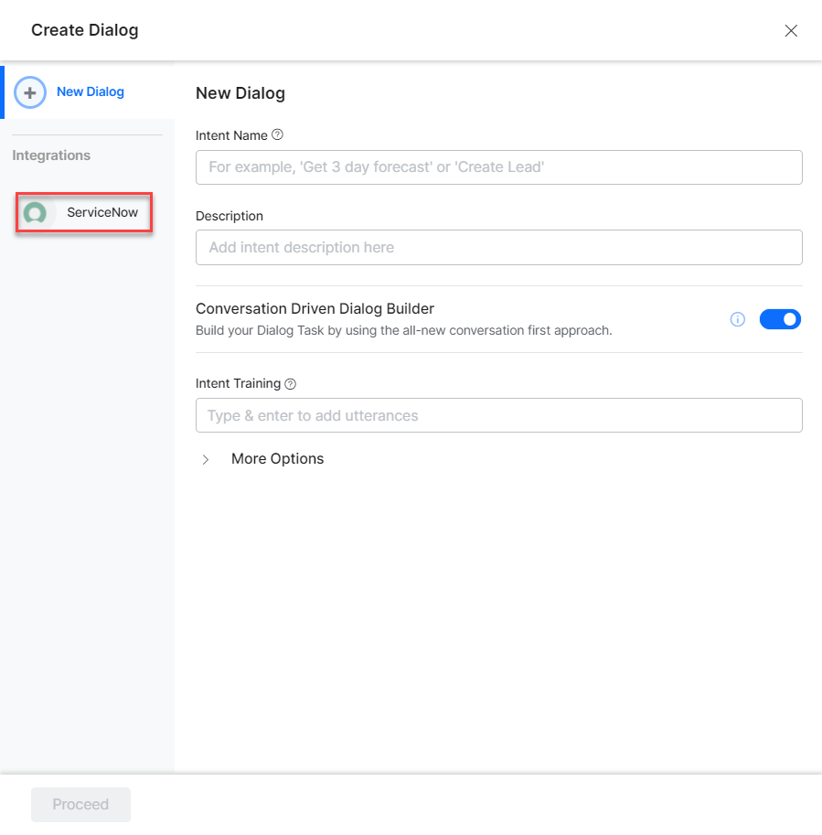 On the Dialog Task pop-up, under the Integration, select the ServiceNow option to view the action templates.