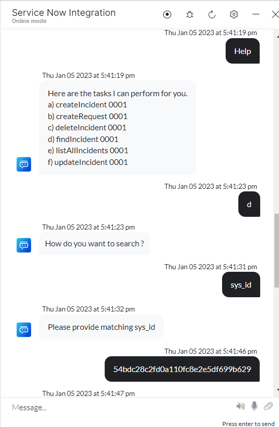 Click the Talk to Bot icon ad follow the prompts in the App console to learn how to find a request. For more information, see step # 3 in the Create an Incident section.