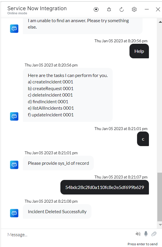 - deleteIncidentMessage – A message node with script to display responses for various scenarios.