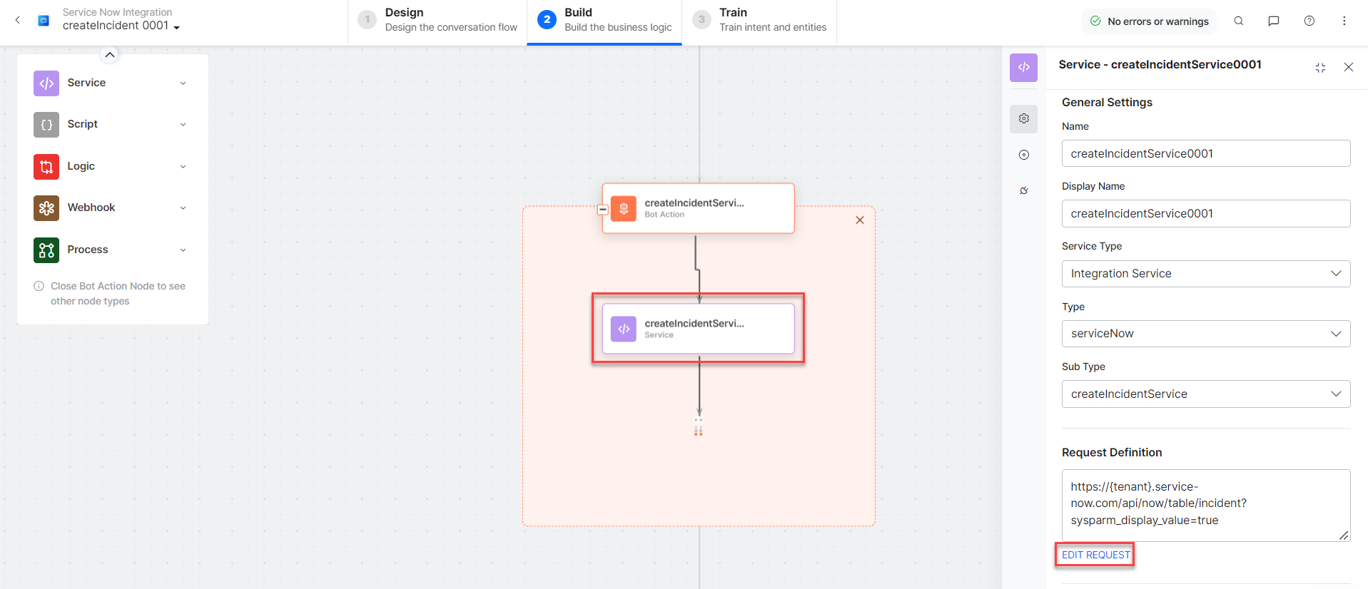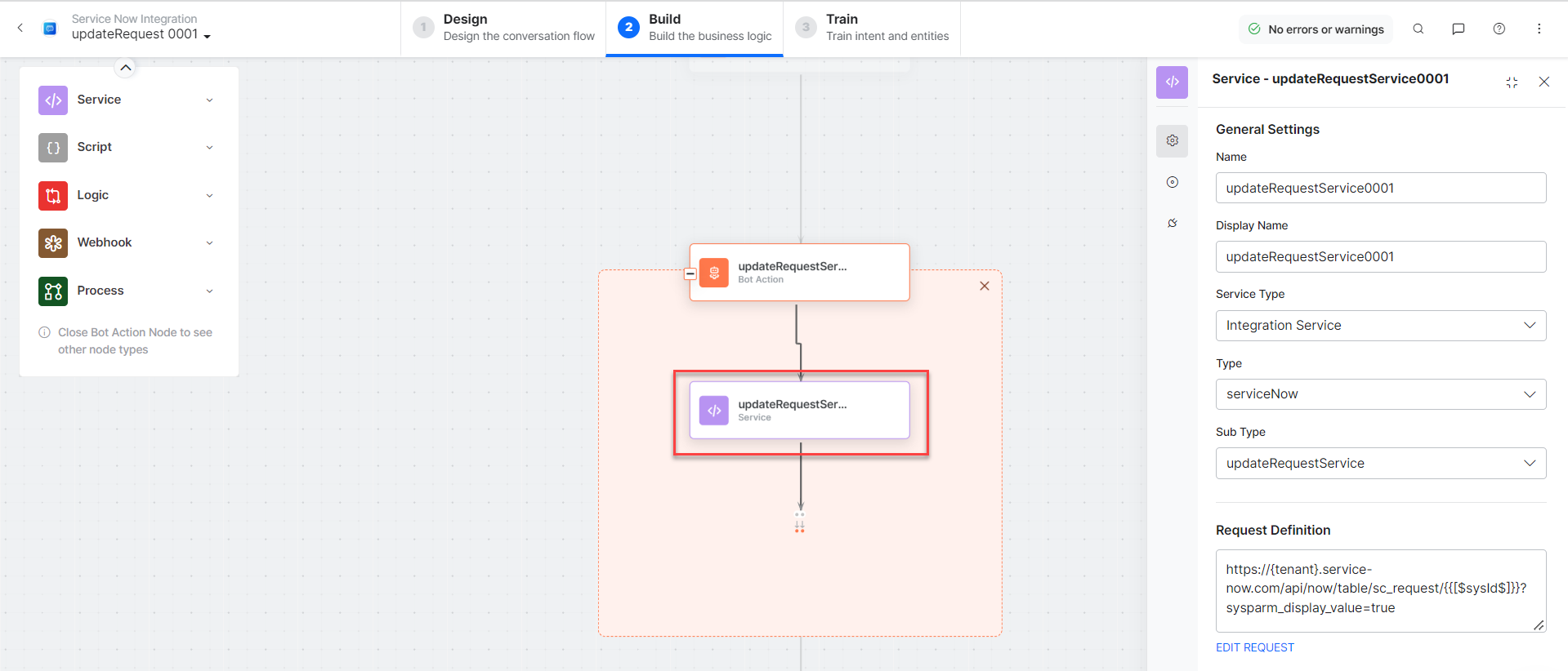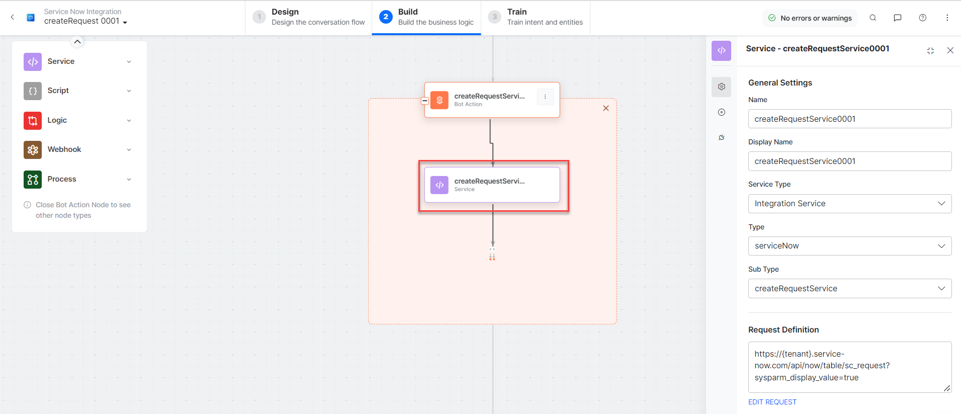 - createRequestService – A bot action service to create a request in an external integration. Click the Plus icon to expand to view the createRequestService bot action component properties.