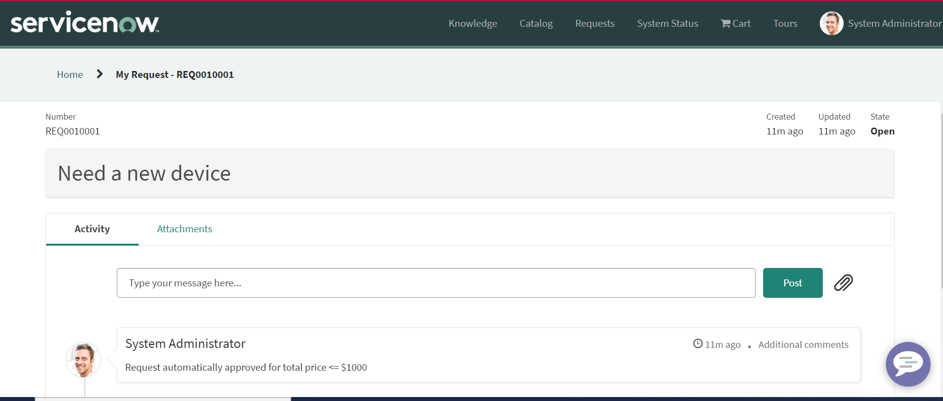 { "result": [ { "parent": "", "delivery_address": "", "made_sla": "true", "watch_list": "", "upon_reject": "Cancel all future Tasks", "requested_for": { "display_value": "System Administrator", "link": "https://dev129509.service-now.com/api/now/table/sys_user/6816f79cc0a8016401c5a33be04be441" }, "sys_updated_on": "2022-09-22 07:06:20", "task_effective_number": "REQ0010071", "approval_history": "", "number": "REQ0010071", "sys_updated_by": "admin", "opened_by": { "display_value": "System Administrator", "link": "https://dev129509.service-now.com/api/now/table/sys_user/6816f79cc0a8016401c5a33be04be441" }, "user_input": "", "price": "$0.00", "sys_created_on": "2022-09-20 21:39:03", "sys_domain": { "display_value": "global", "link": "https://dev129509.service-now.com/api/now/table/sys_user_group/global" }, "state": "Open", "route_reason": "", "sys_created_by": "admin", "knowledge": "false", "order": "", "calendar_stc": "", "special_instructions": "", "closed_at": "", "cmdb_ci": "", "delivery_plan": "", "contract": "", "impact": "3 - Low", "active": "true", "work_notes_list": "", "business_service": "", "priority": "4 - Low", "sys_domain_path": "/", "time_worked": "", "expected_start": "", "opened_at": "2022-09-20 21:39:03", "business_duration": "", "group_list": "", "work_end": "", "approval_set": "2022-09-20 21:39:03", "work_notes": "", "universal_request": "", "short_description": "NEW SD", "correlation_display": "", "delivery_task": "", "work_start": "", "assignment_group": "", "parent_interaction": "", "additional_assignee_list": "", "description": "more December on request", "calendar_duration": "", "close_notes": "", "service_offering": "", "sys_class_name": "Request", "closed_by": "", "follow_up": "", "sys_id": "beddf9f5478611105474f088436d43a4", "contact_type": null, "urgency": "3 - Low", "requested_date": "", "company": "", "reassignment_count": "0", "activity_due": "UNKNOWN", "assigned_to": "", "comments": "2022-09-20 21:39:03 - System Administrator (Additional comments)\nRequest automatically approved for total price <= $1000\n\n", "approval": "Approved", "sla_due": "UNKNOWN", "comments_and_work_notes": "2022-09-20 21:39:03 - System Administrator (Additional comments)\nRequest automatically approved for total price <= $1000\n\n", "due_date": "", "sys_mod_count": "2", "sys_tags": "", "request_state": "Approved", "stage": "Requested", "escalation": "Normal", "upon_approval": "Proceed to Next Task", "correlation_id": "", "location": "" }] } -