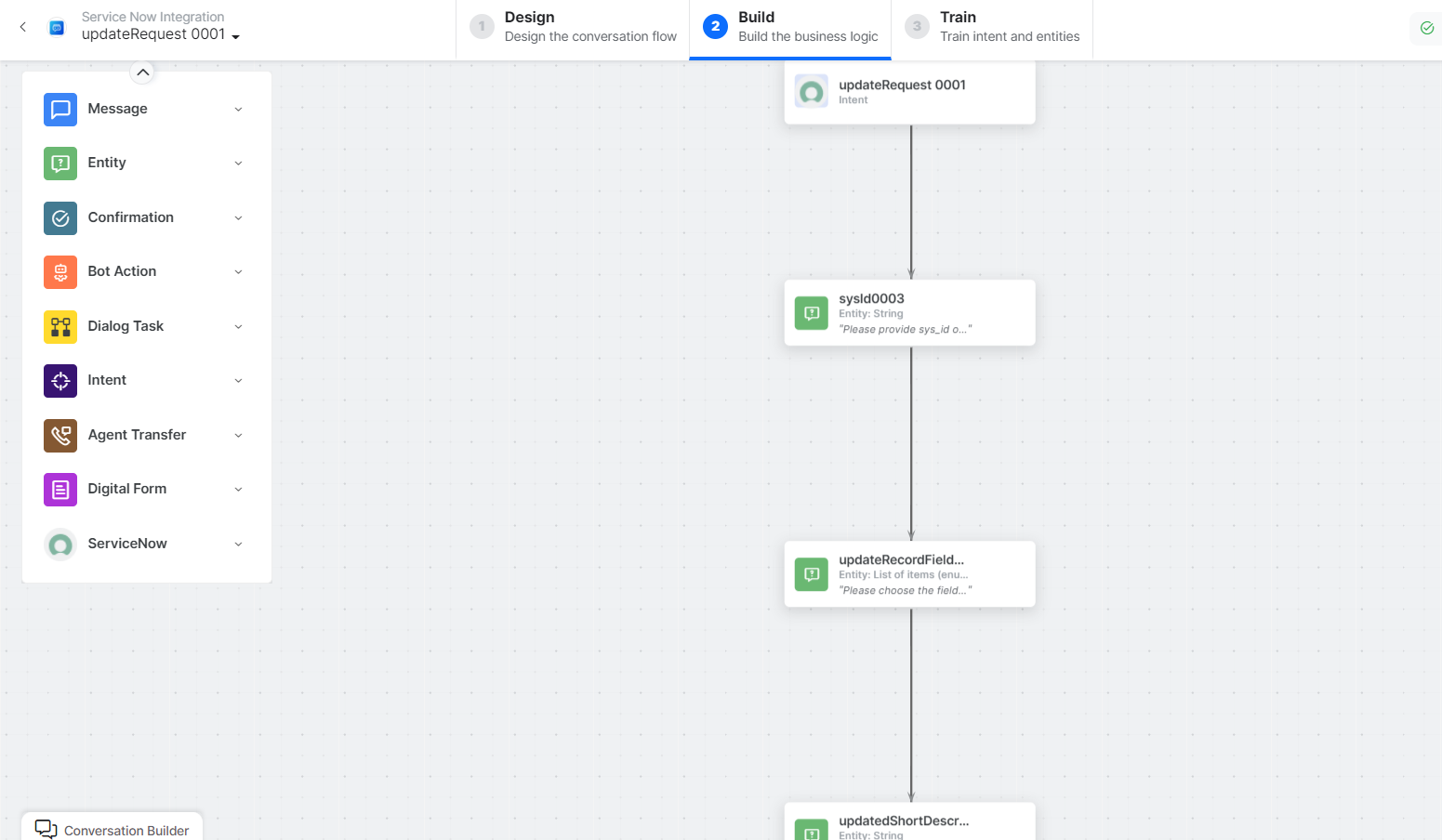 - SysId, updateRecordFields, updatedShortDescription, and updatedDescription – Entity nodes for updating the request details.