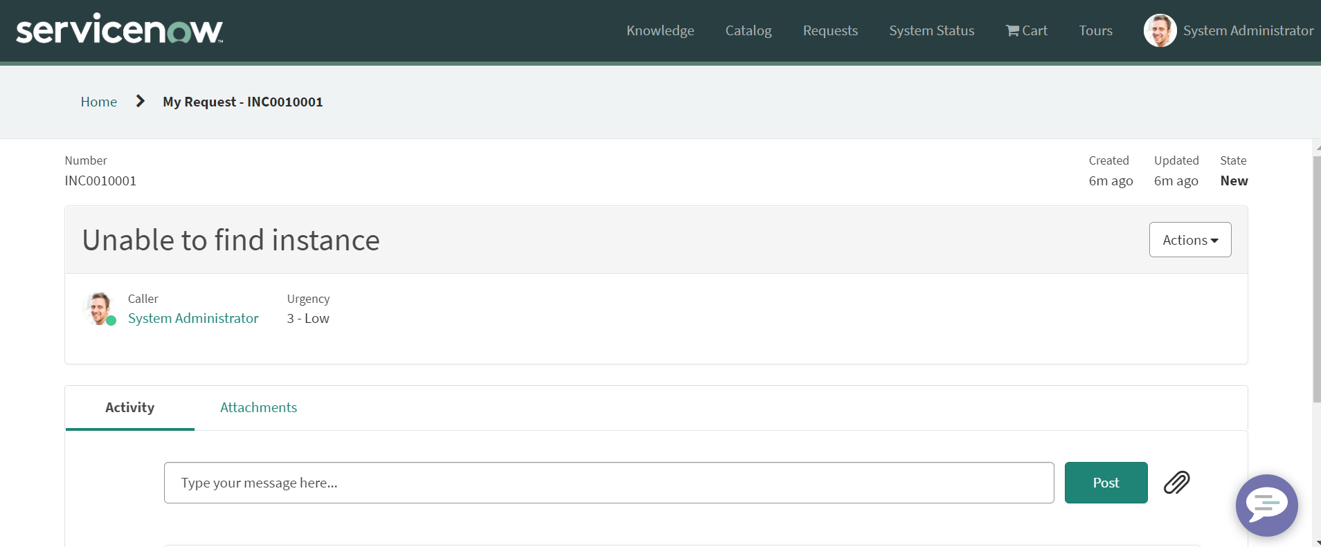 Click the Talk to Bot icon ad follow the prompts in the App console to learn how to update a request. For more information, see step # 3 in the Create an Incident.