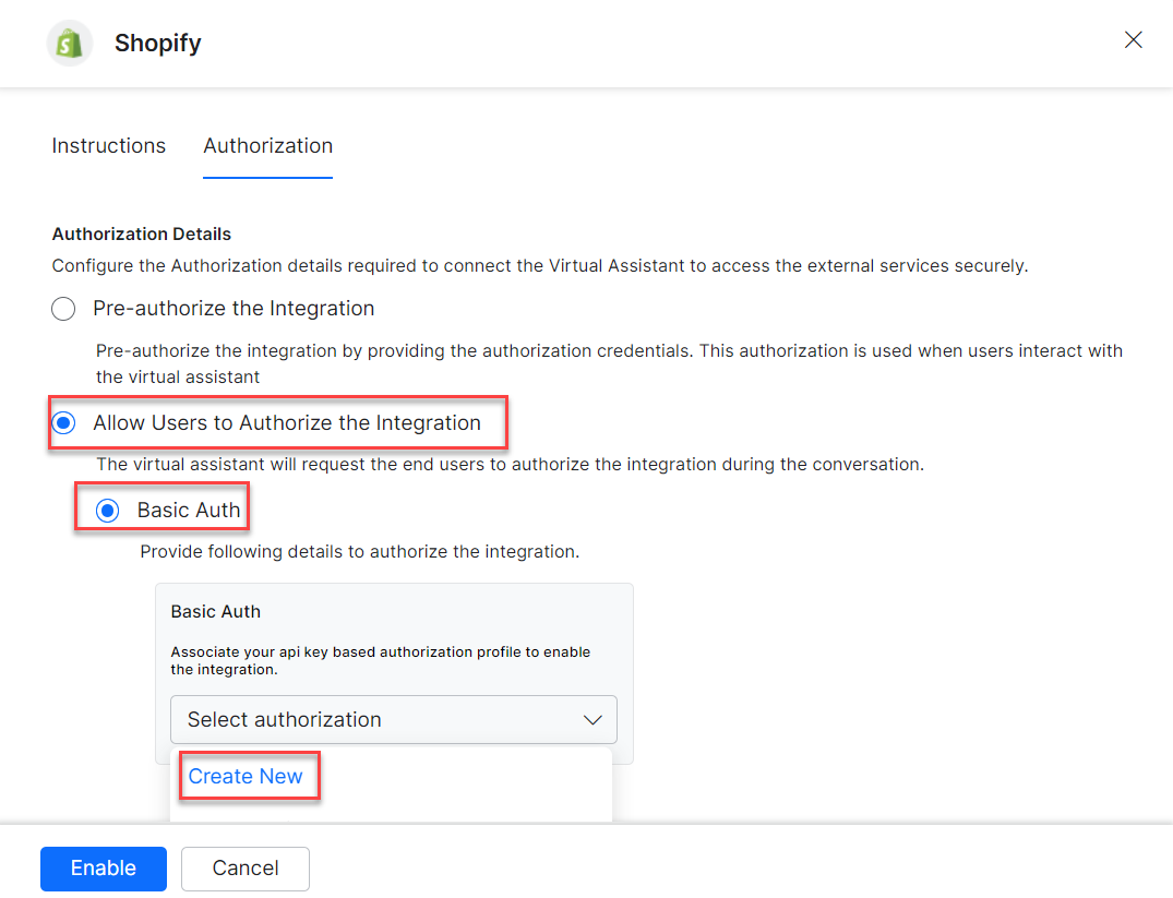 Create your authorization profile to obtain an access token and use it to complete integration without using Kore.ai’s Shopify app for authorization. To create a profile, click the Select Authorization drop-down and select the Create New option.
