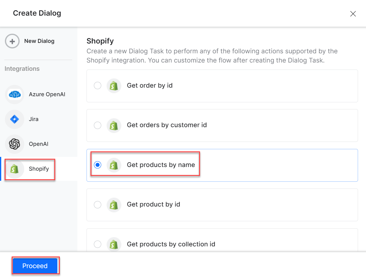 Select the desired dialog task from the templates and click Proceed. For example, select the Get products by name task.