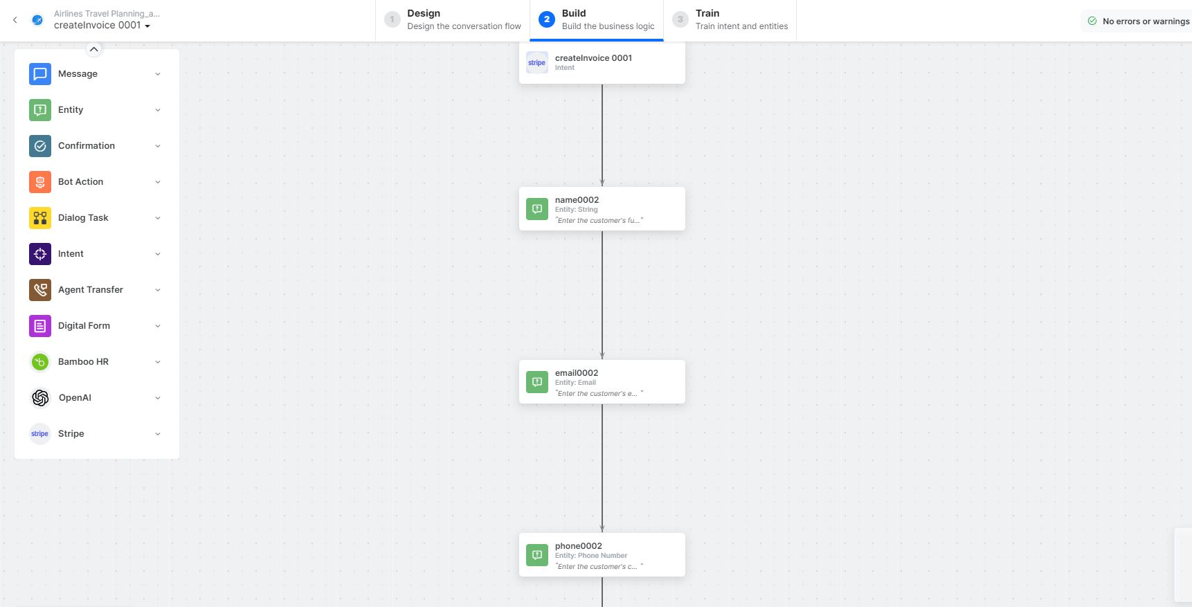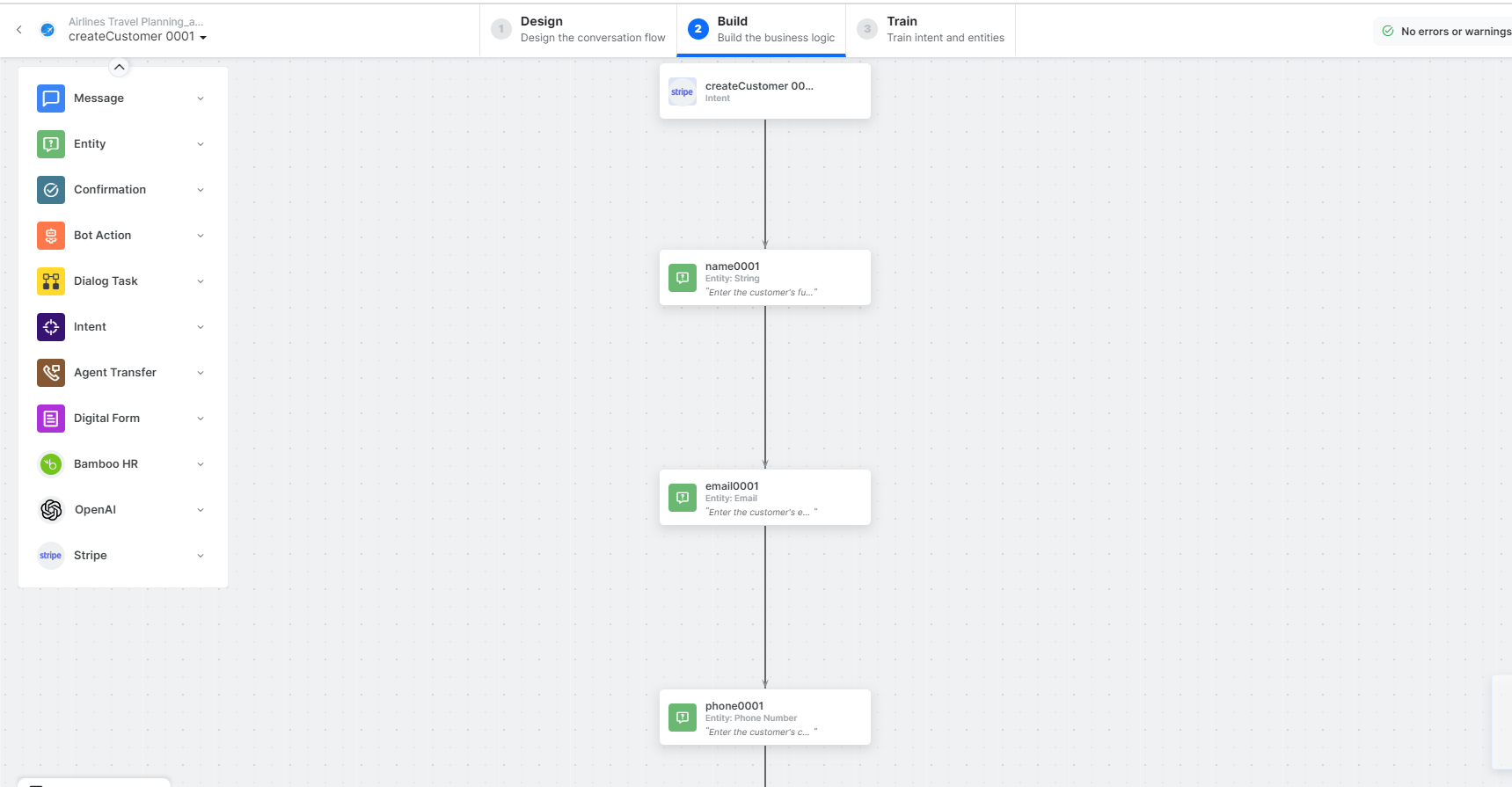 - name, email, and phone – Entity nodes for gathering the required customer details.